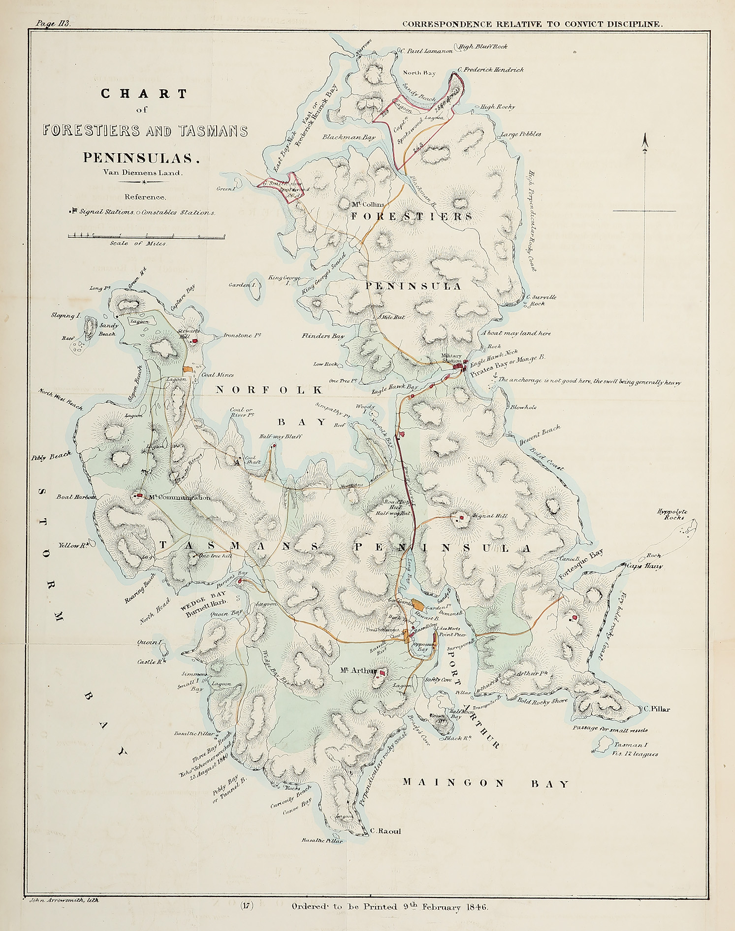 Arrowsmith’s rare map date 1846 of the Forestier and Tasman Peninsulas showing signal stations, constable stations and the description of topography. From Hansard, Correspondence relative to Convict Disciplines, London