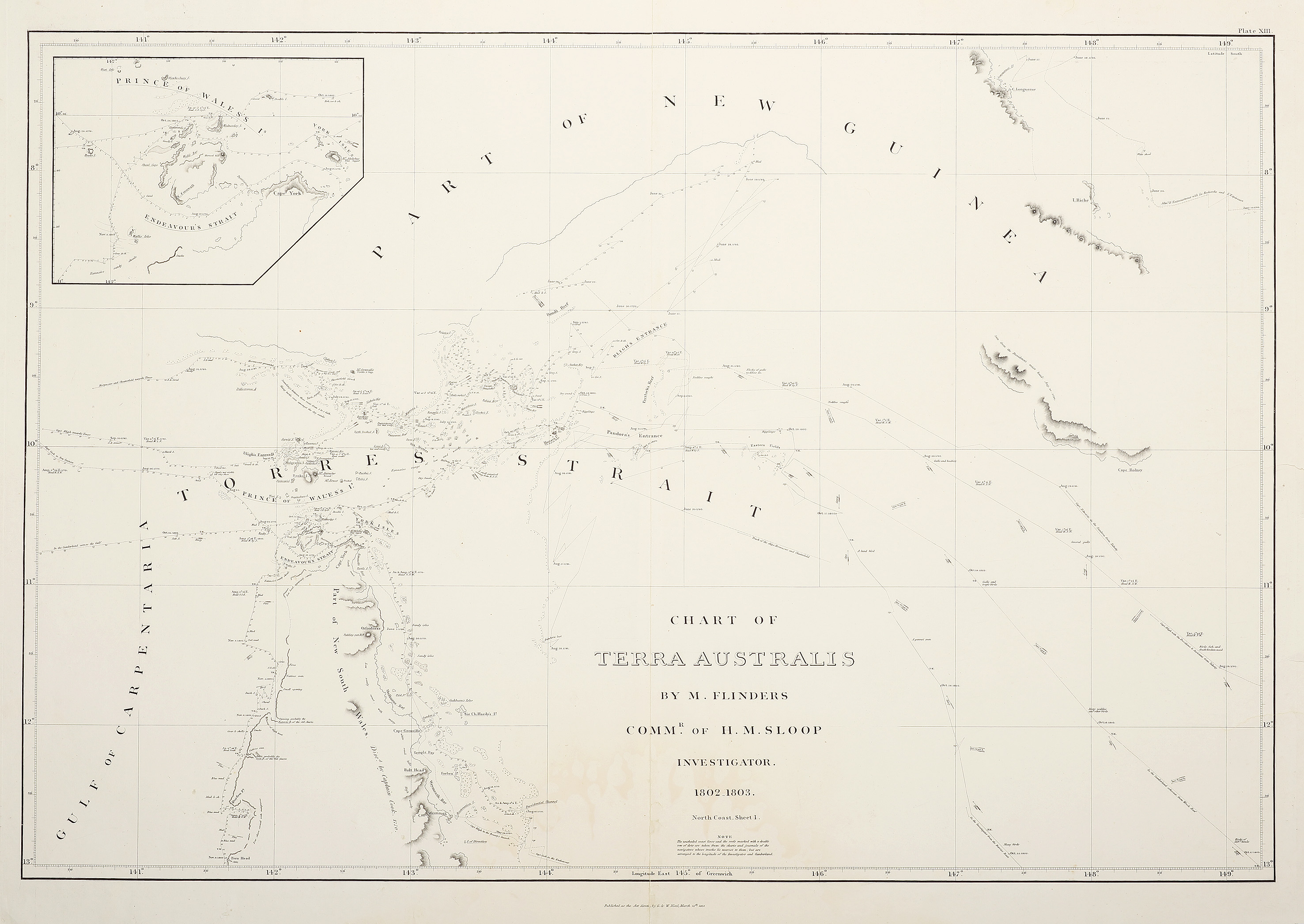 Very rare and historically important c.19th chart of Cape Yorke Peninsula extending from Cape Weymouth to Cape York, Torres Strait and sections of the south coast of New Guinea by Matthew Flinders, from the special “Imperial” issue, of the first edition of his Atlas.