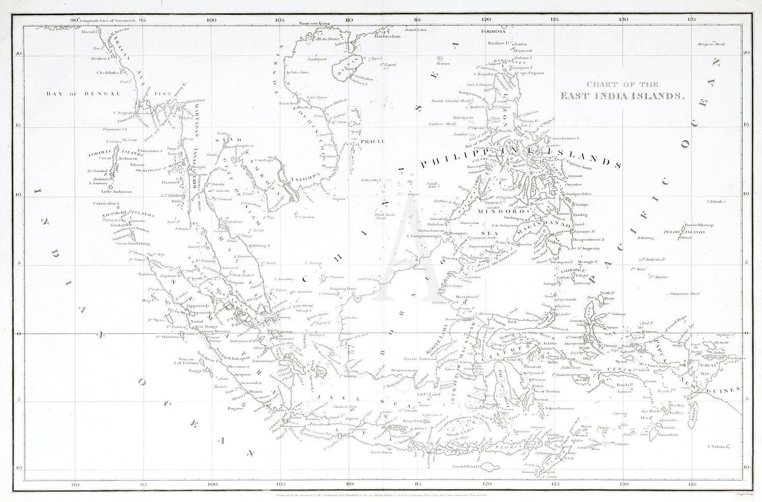 Finely engraved detailed map of the East Indies by one the most important of British late C18th map makers. Highly regarded Arrowsmith produced a number of important charts of Asia which were used and copied by other mapmakers.