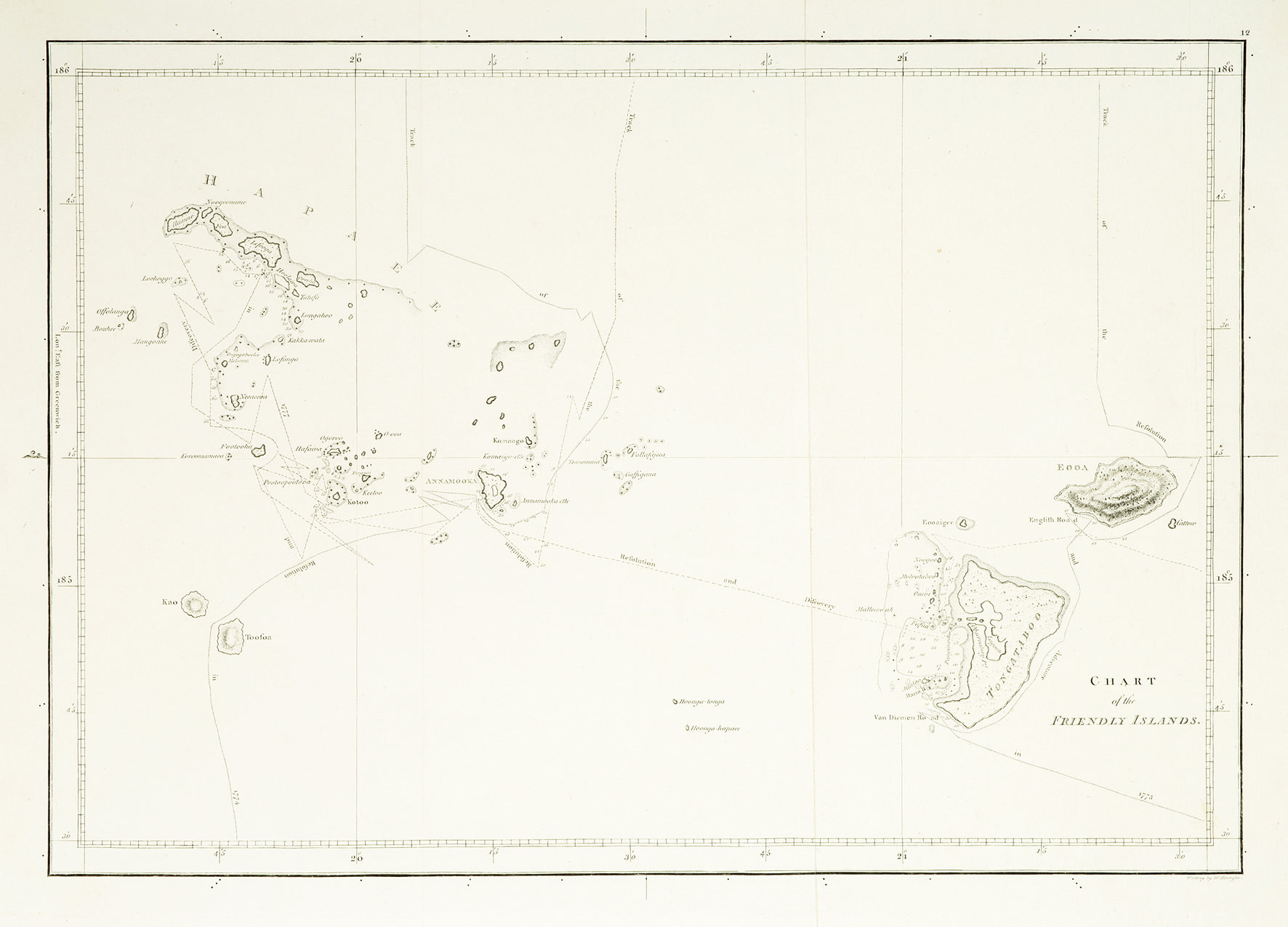 Chart of the Friendly Islands (Tongan group). Cook had previously visited the islands on his second voyage 2 – 8 October 1773 and then again 26 – 29 June 1774, after which the ships became separated and were never to meet again.