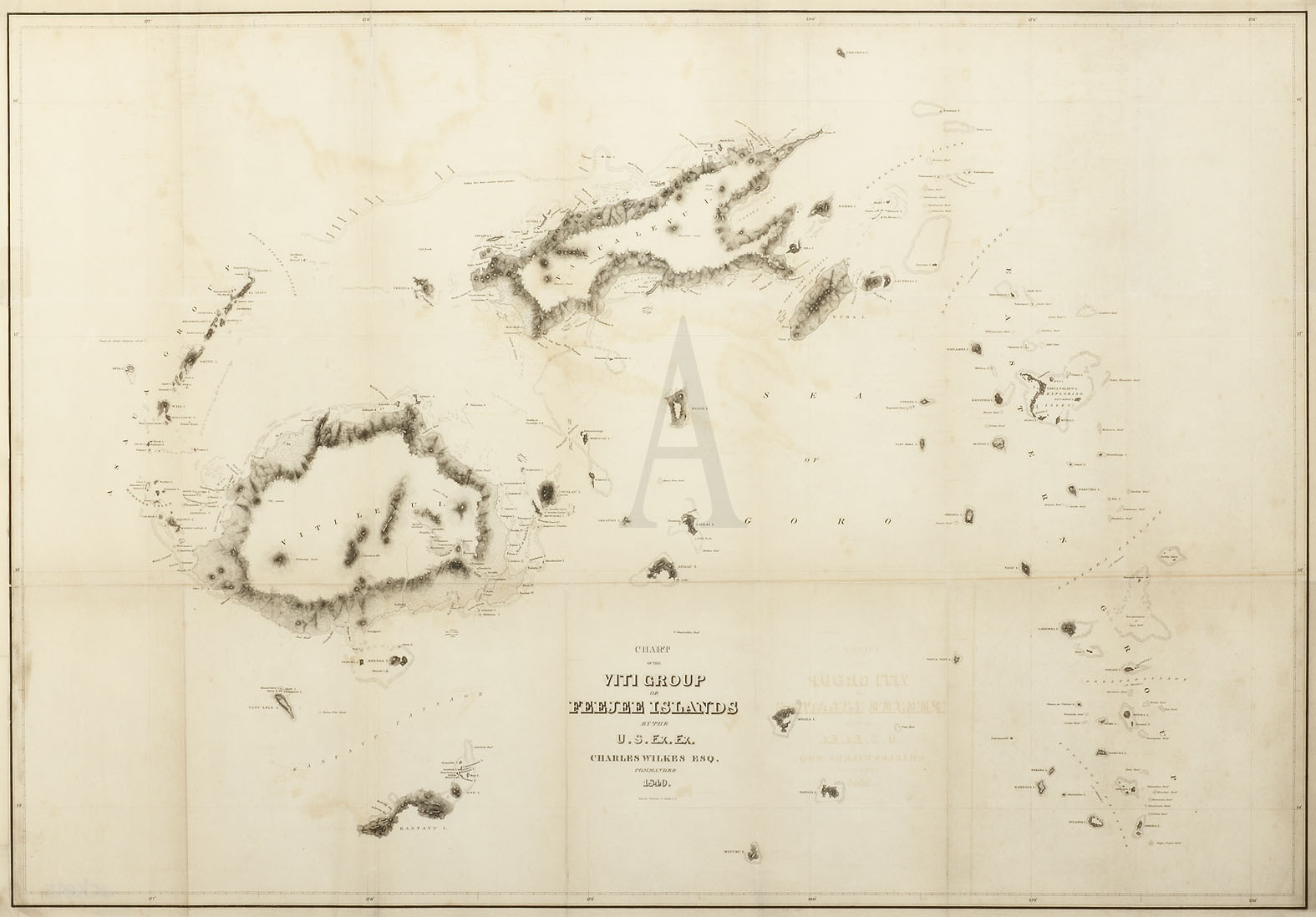 A superb and rare map of the Fijian Islands from the first American voyage around the world 1838-42 under the command of Lieutenant Charles Wilkes. Wilkes explored the islands from 6th May to 10th August 1840. The expedition had numerous accomplishments, including mapping almost three hundred islands, a thorough exploration of the American Northwest coast, and establishing Antarctica as a continent.