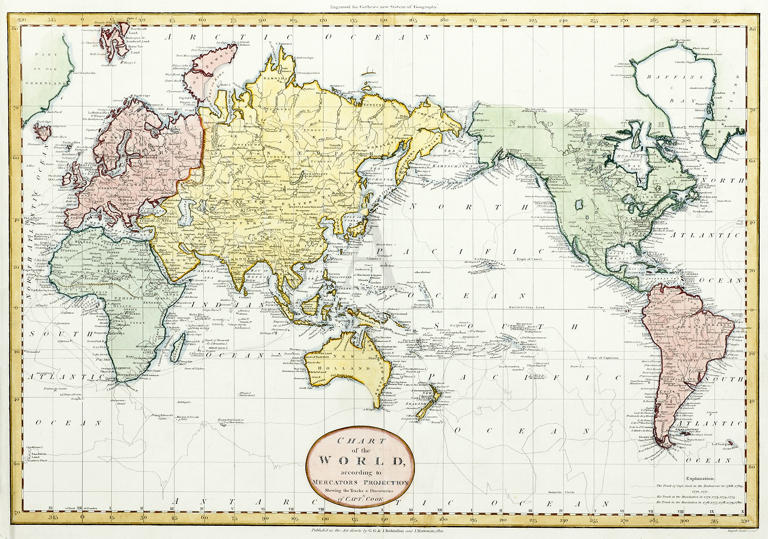 Detailed world map showing the tracks of Cooks three epic voyages of discovery and based on Roberts chart issued in the official accounts of Cooks voyage first publised in 1784.