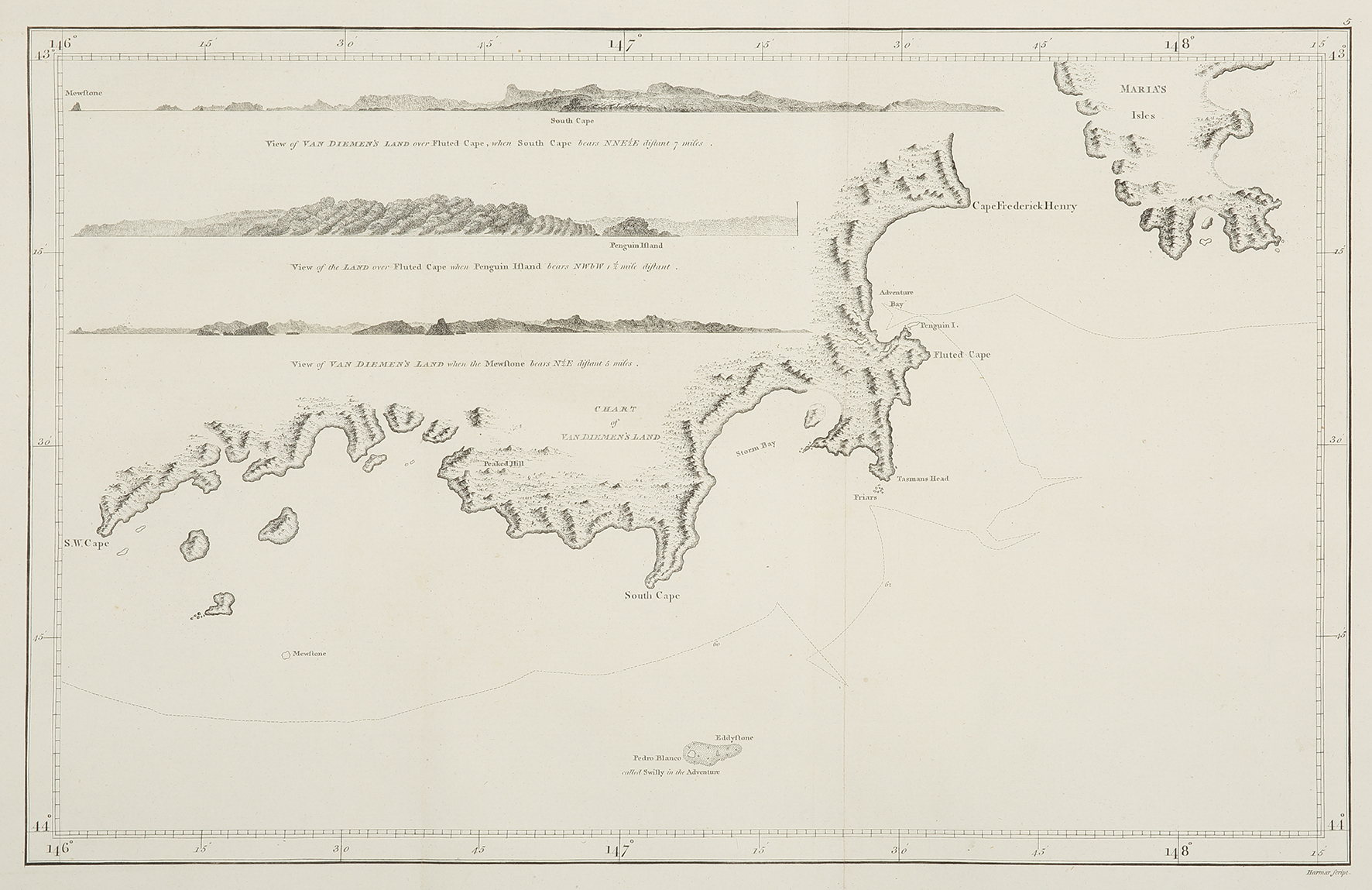 Inset coastal profiles View of Van Diemen’s Land over Fluted Cape, when South Cape bears NNE1/2E distant 7 miles.