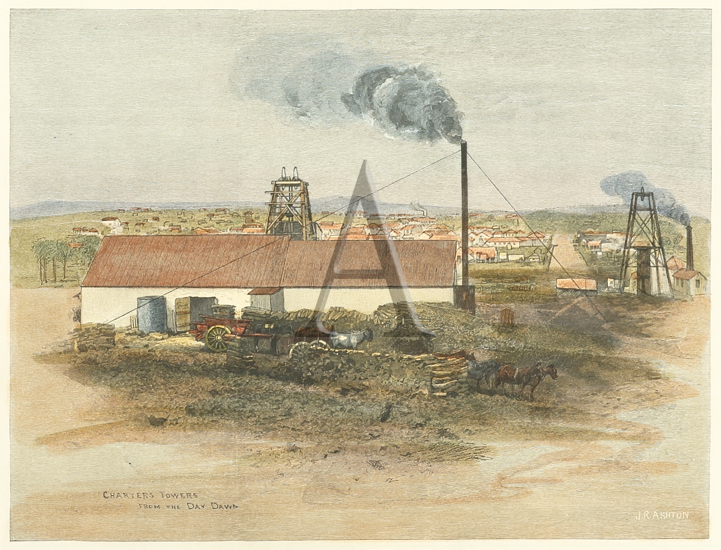 Colonial engraving of Charters Towers from the Day Dawn Claim. The original Day Dawn P.C. was taken up by a group of German miners and was the first to give Charters Towers a good start. The ground was first worked … Read Full Description