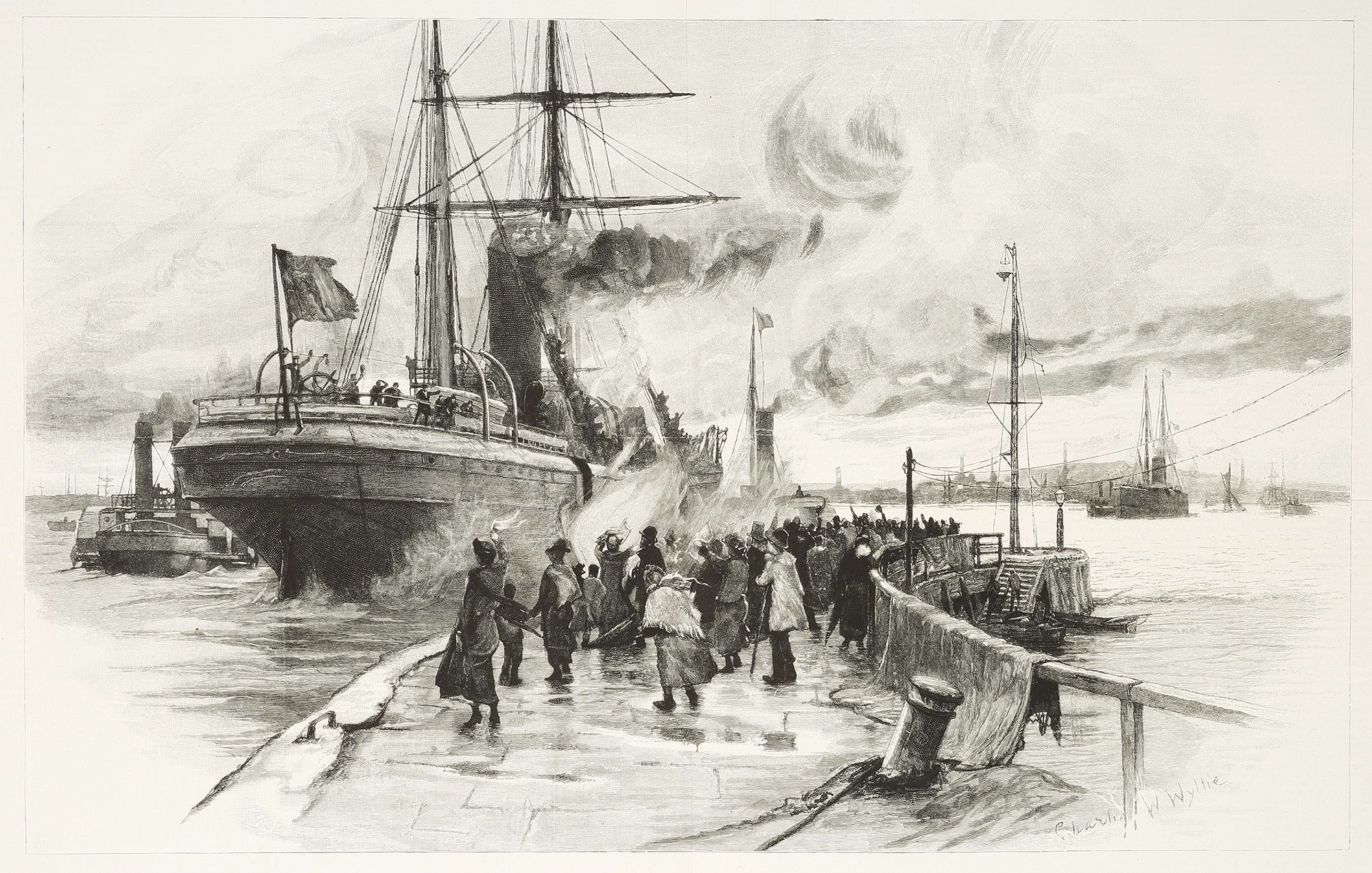 Scarce, large colonial engraving of an emigrant ship leaving the home port. From the original edition of The Graphic.