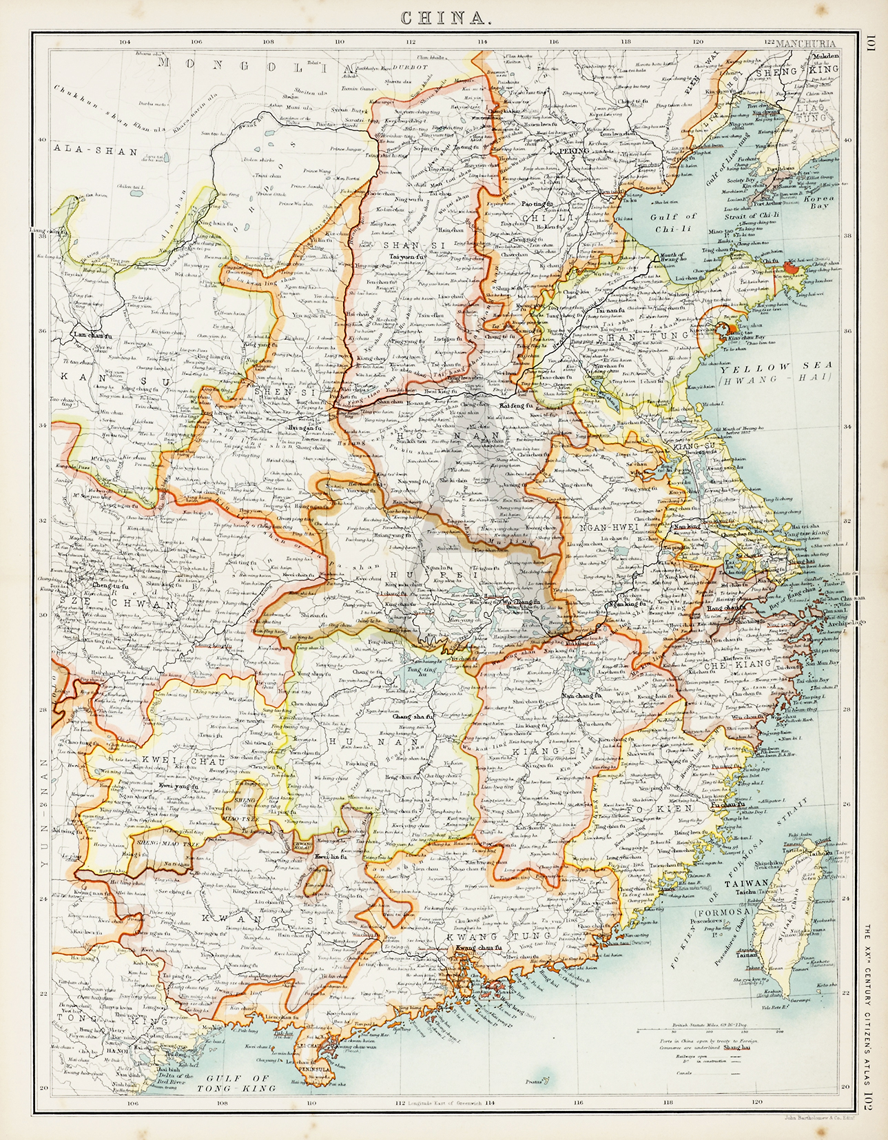 Detailed early c.20th map of China with extensive inland information, by the important Scottish map publishers, John Bartholomew and Sons, Edinburgh.