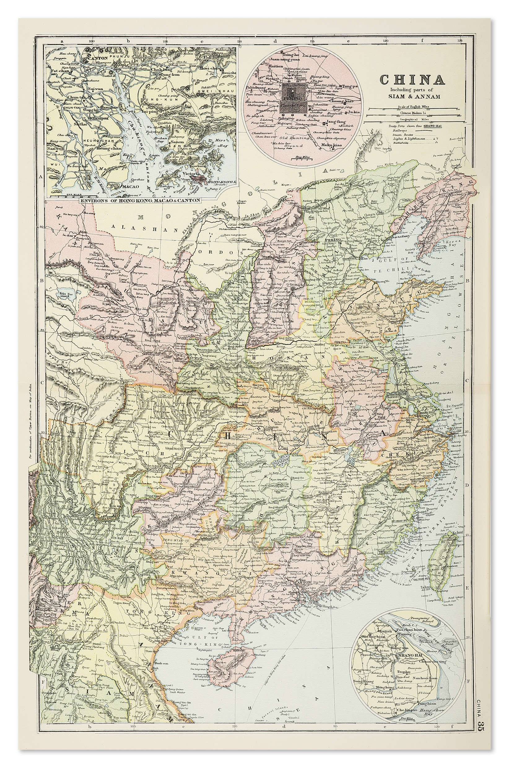 Fabulous detailed late C19th map of China and Vietnam with insets of Hong Kong, Beijing and Shanghai. Shown are sea routes to major ports with distances.