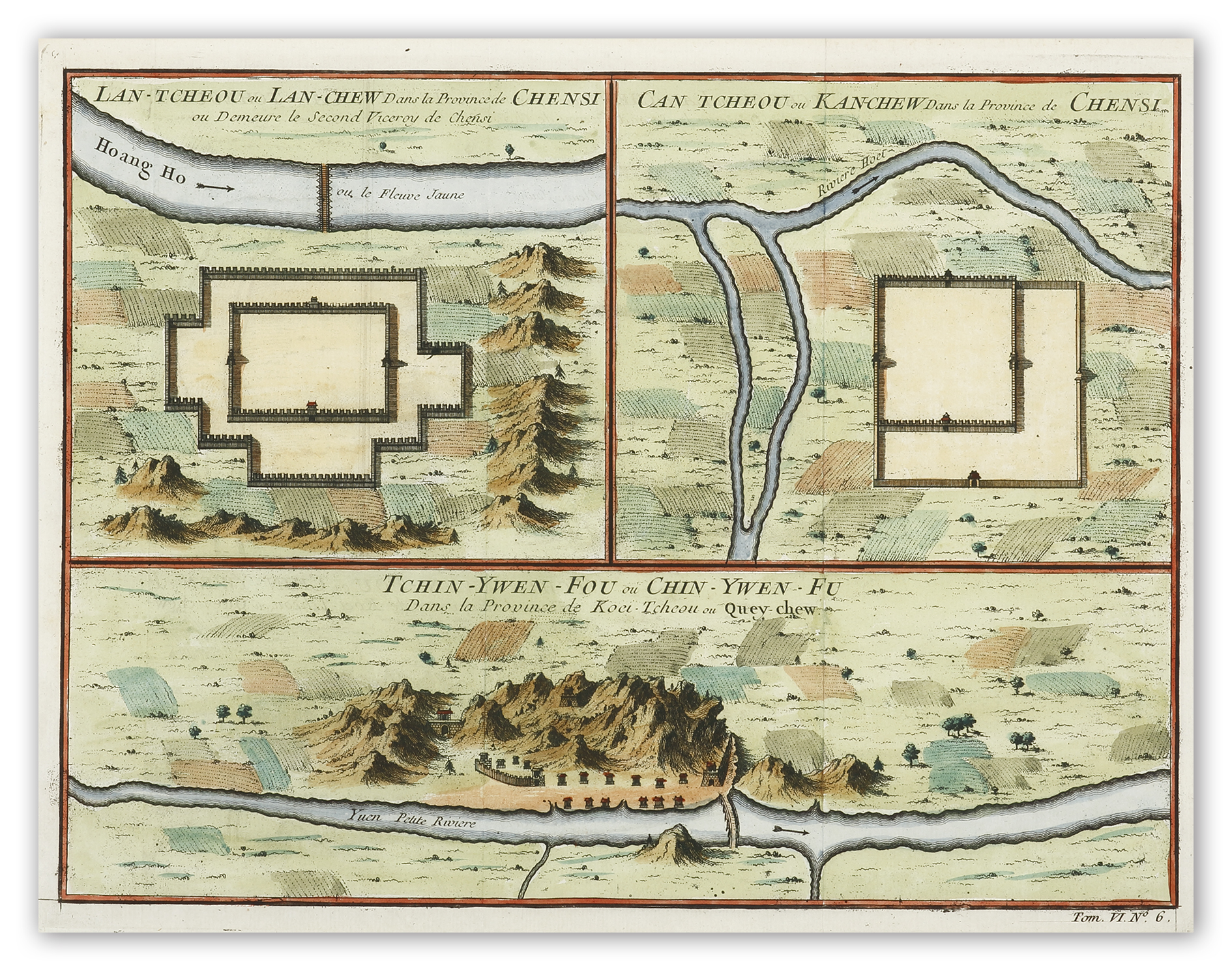 Superb hand coloured engraved map of three forts in Shanxi province. Lanzhou, the capital city of northwest China’s Gansu province. Ganzhou in prefecture city of Zhangye in Gansu Province. Guiyang in the Guizhou province From Prevost, Histoire generale des voyages.