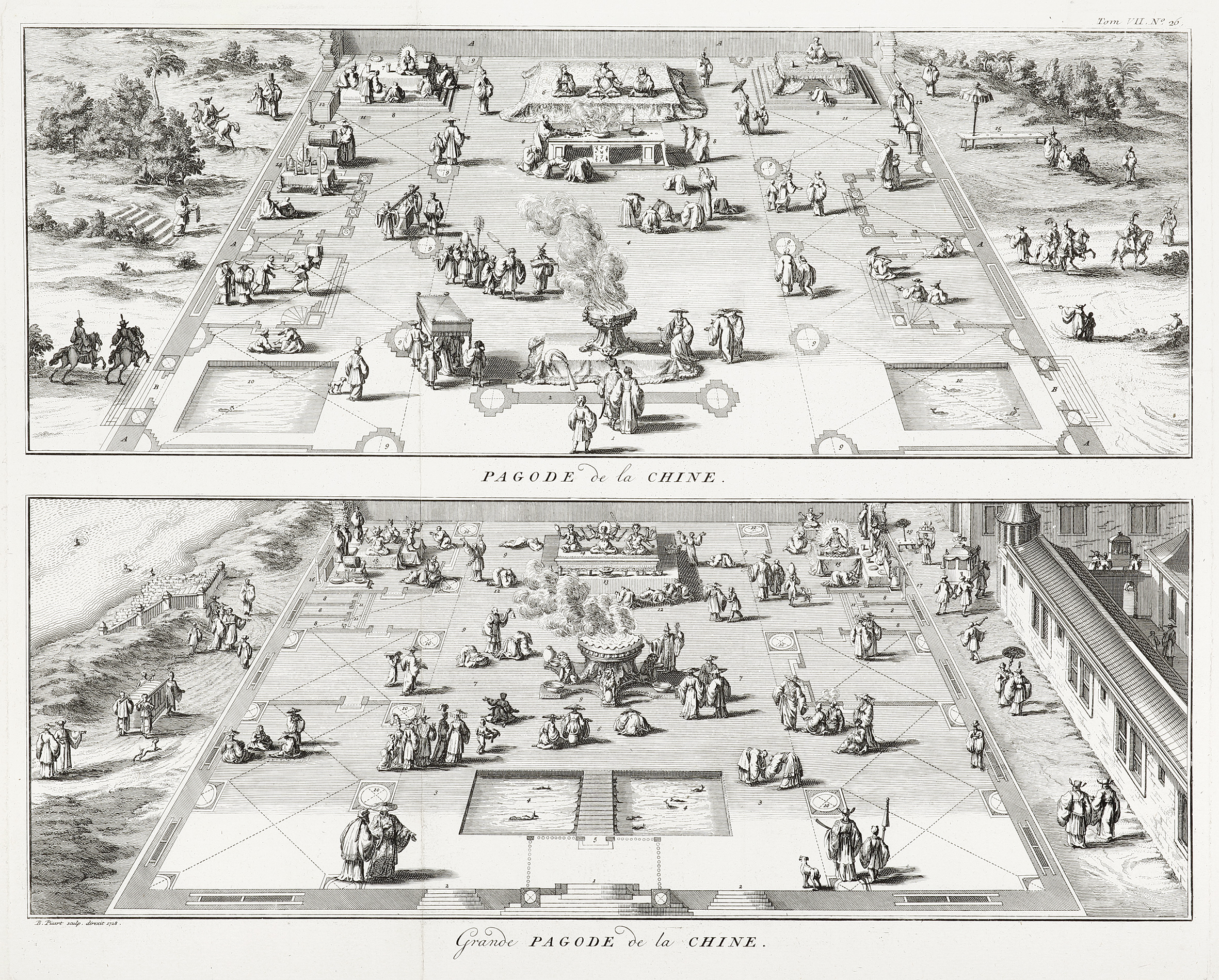 C.18th layout and plan of Chinese pagodas. Top : A Chinese pagoda with a sacrificial column in the centre and statues of gods in the back. Bottom: A large Chinese pagoda. From Denis Diderot’s, Encyclopaedia which was a monument in … Read Full Description