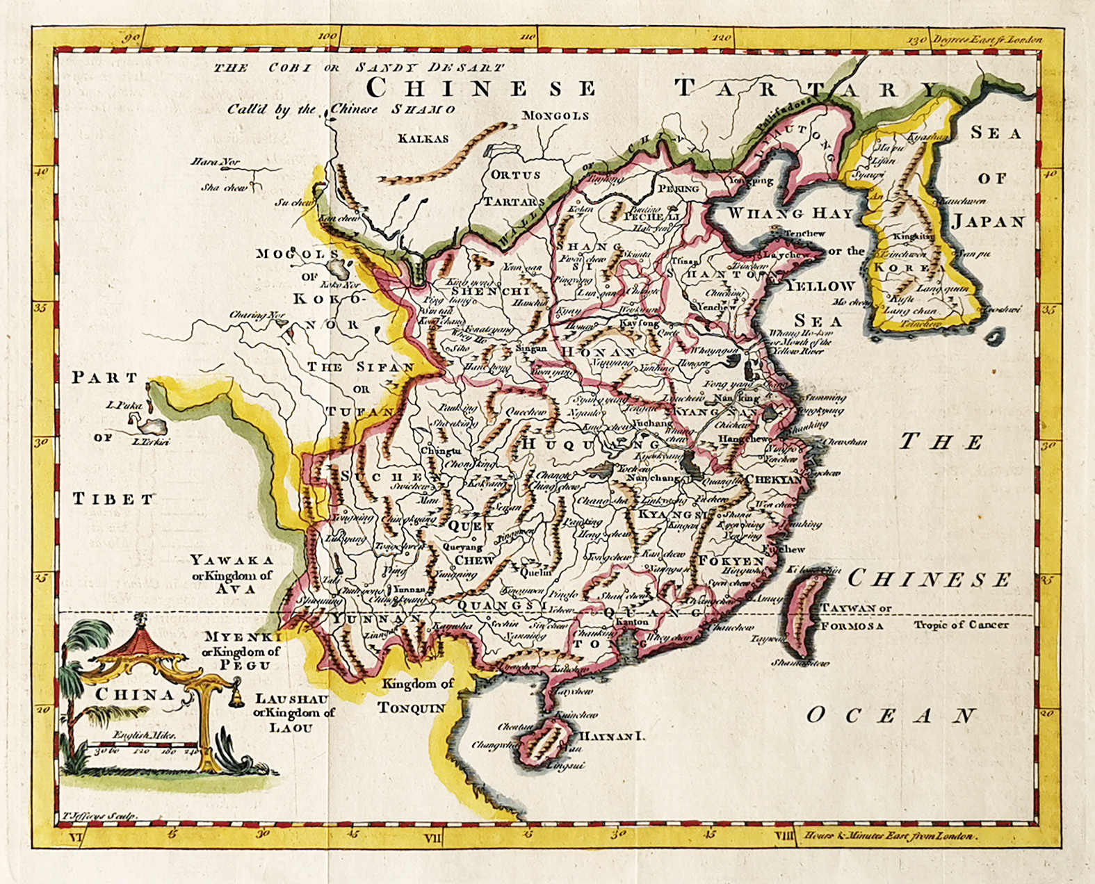 Small C18th map of China with a decorative title cartouche at lower left. Taiwan is name ‘Taywan or Formosa‘. Korea is prominently mapped. From: Salmon’s A New Geographical and Historical Grammar.