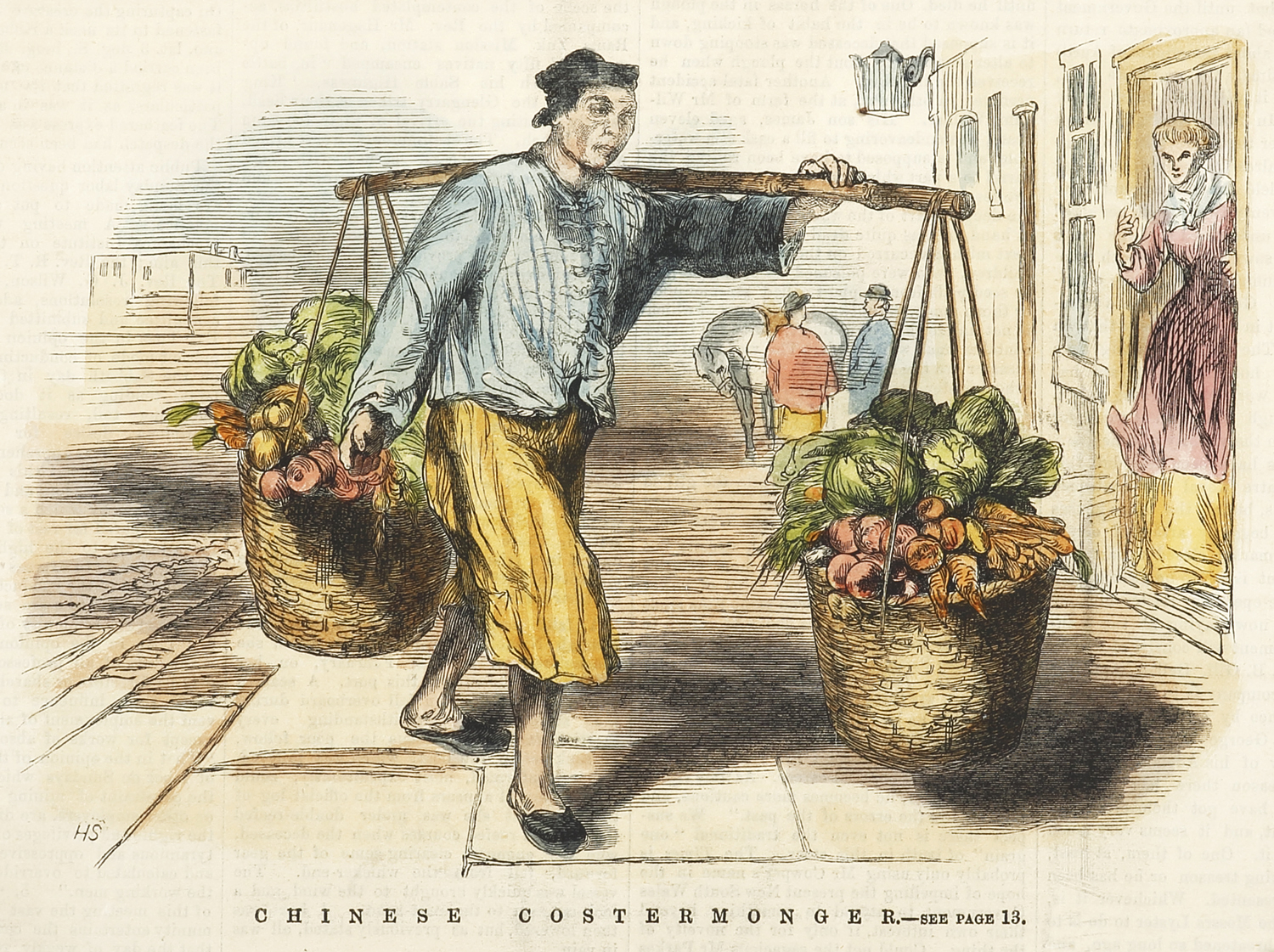 Rare colonial engraving of an Australian Chinese costermonger (fruit and vegetable seller), a term derived from the words costard (a medieval variety of apple) and monger (seller), and later came to be used to describe hawkers in general.