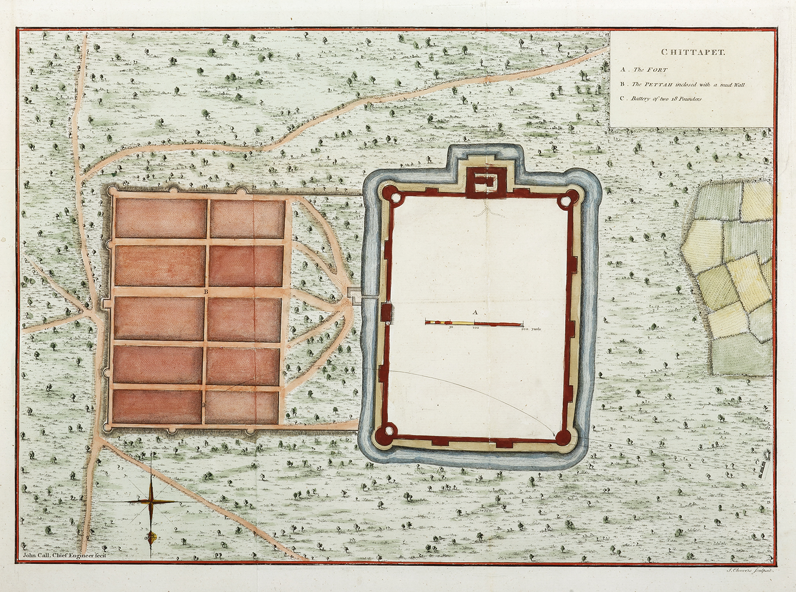 Rare c.18th map of the fort at Chittapet where British and French forces led by Saubinet forced the British to quit Wandiwas and captured Chittapet, Tiruvannamalai and some forts in the vicinity.