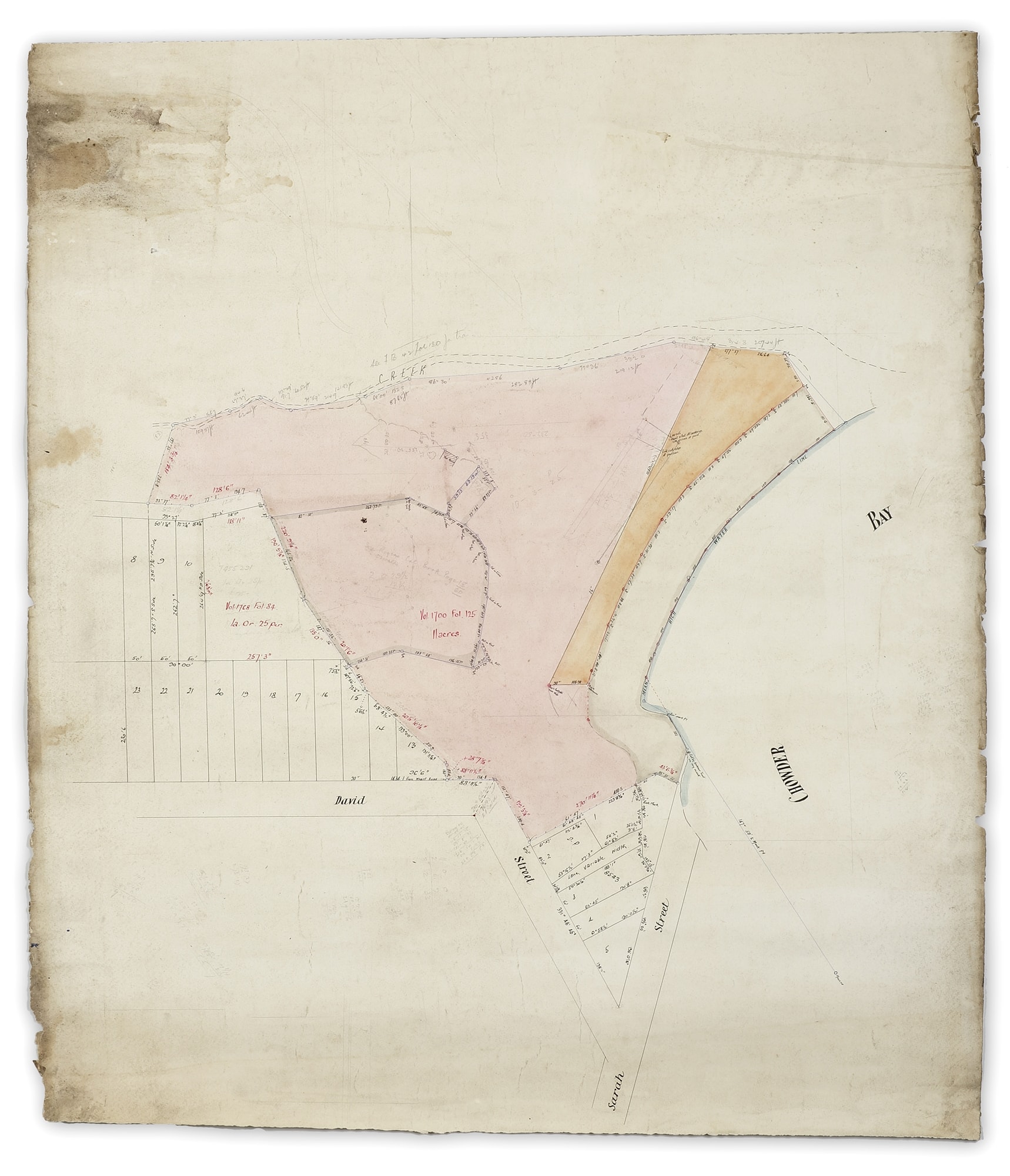 Rare c.19th manuscript and watercolour survey map of Chowder Bay made in 1890