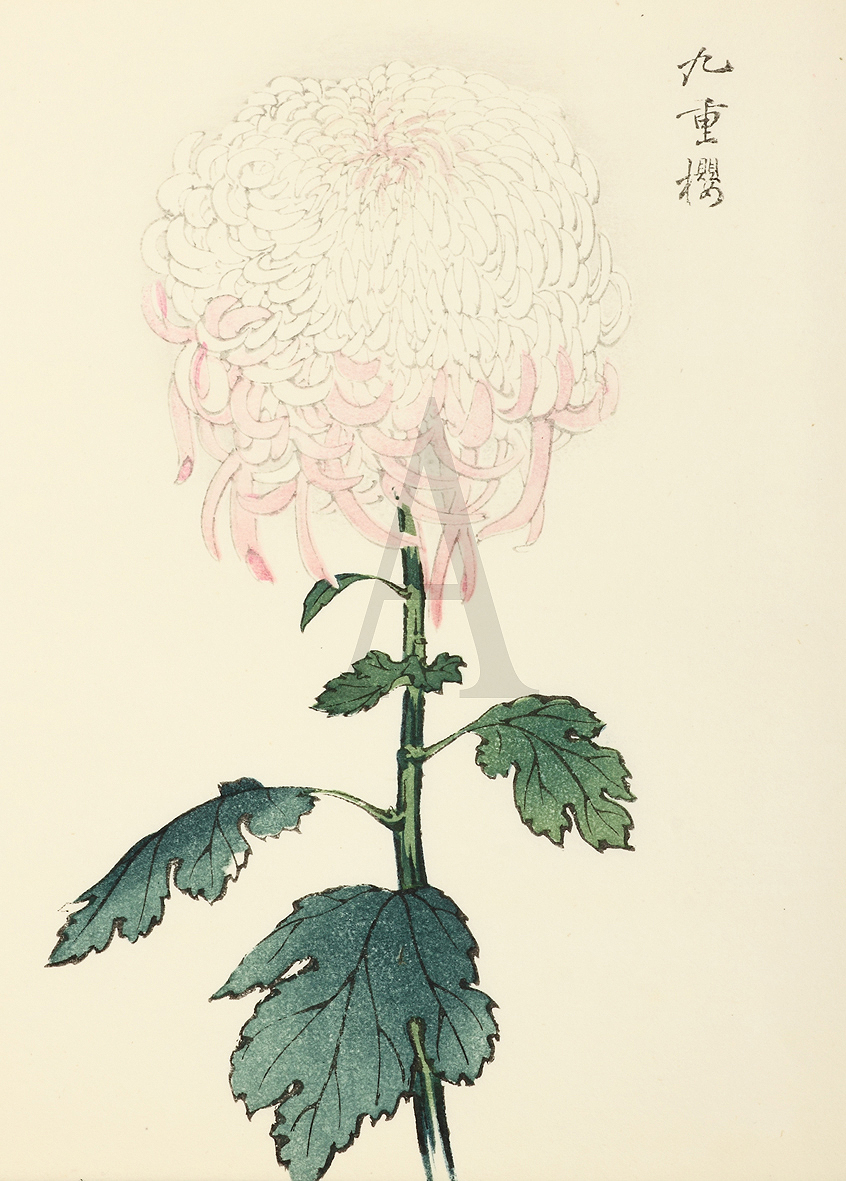 Chrysanthemums came to Japan from China around the 8th century A.D., and the Emperor adopted the 16-petalled flower, or Ichimonjiginu, as the crest and official seal. The Imperial throne of Japan is referred to as the Chrysanthemum Throne. Regarded as a symbol of the sun, perfection, and long life, the chrysanthemum is celebrated by the Japanese during the annual Festival of Happiness held in November. Keika Hasegawa was active from 1893 to 1905, is best known for this series of chrysanthemums and was influenced by earlier Japanese botanical studies (kacho-e) and the introduction of the Pre-Raphaelite movement to Japan.