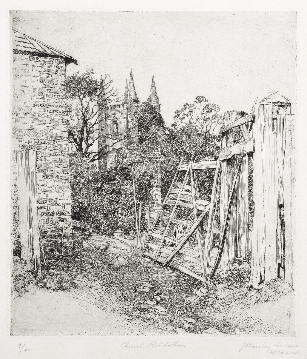 Fine etching by the master print maker John Barclay Godson of Carnarvon All Saints Church ruins, Port Arthur. The ruins of the church and the Commandant’s House stand on the highest ground at either end of the Port Arthur penal … Read Full Description