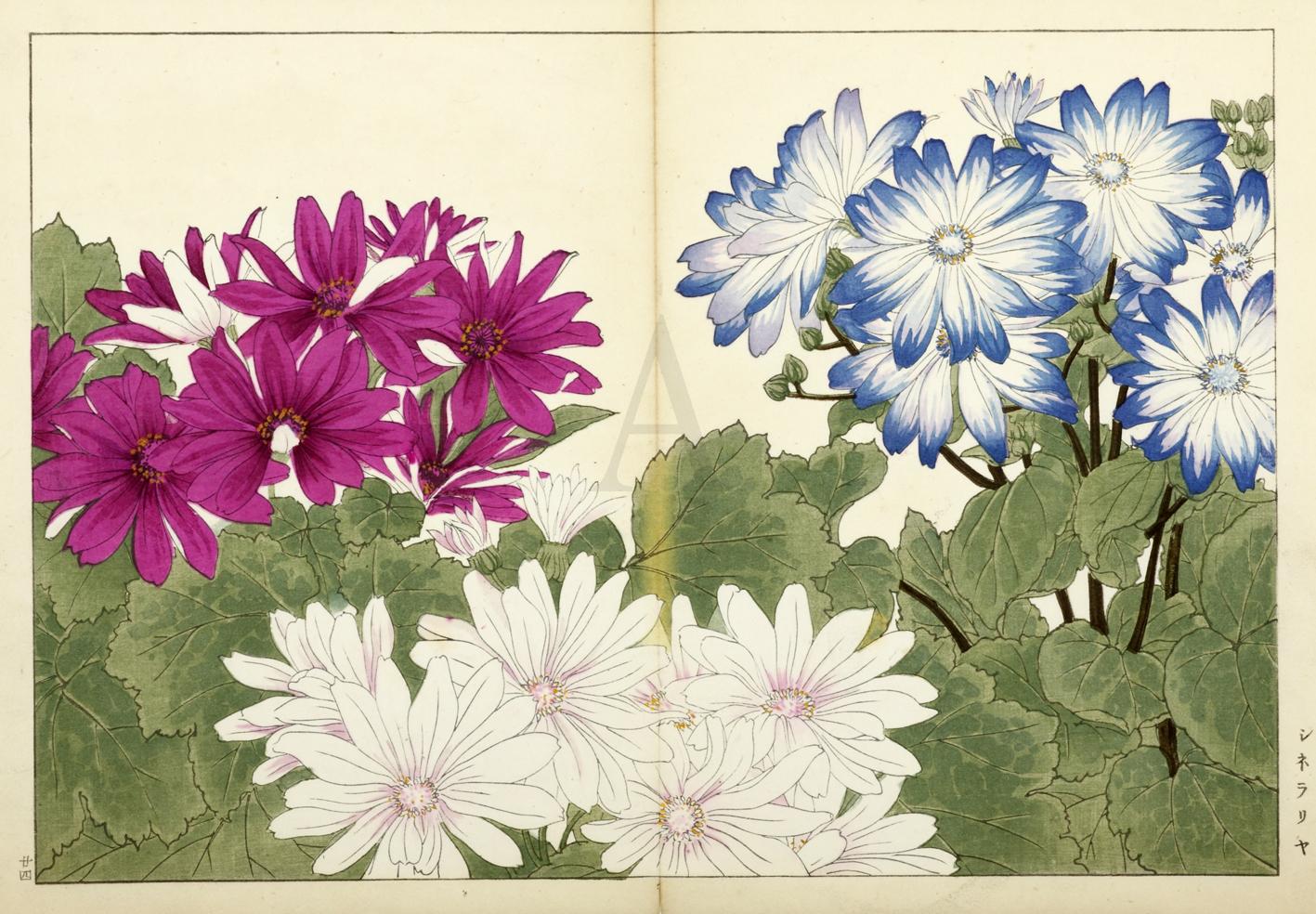 Woodblock of Cineria’s by Tanigami Konan, from the series, Seiyo Soka Zofu, or a Pictorial Book of Western Flowers