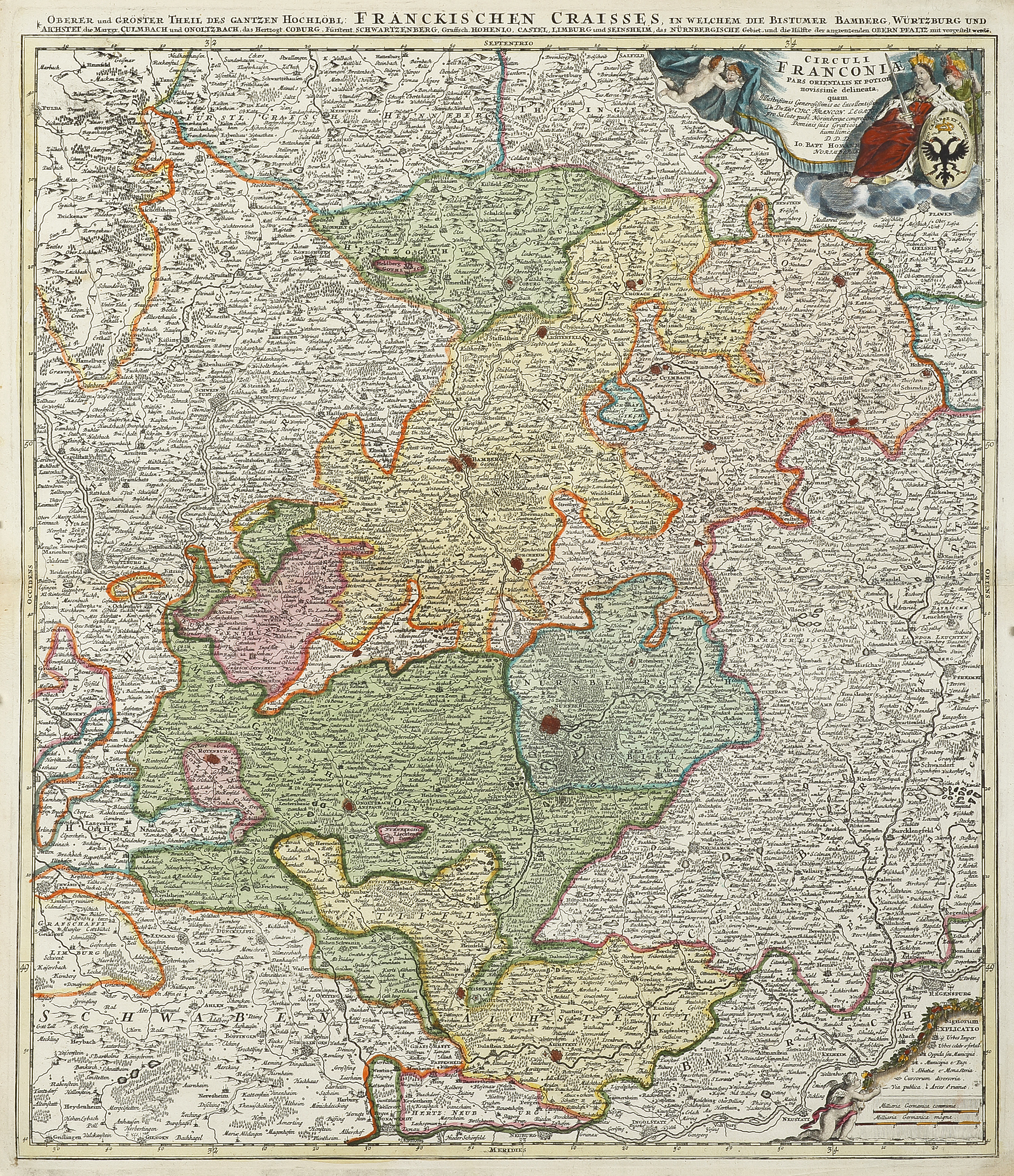 Map of Franconia, extends from Wurtzburg in the west, Neuburg in the south, Pereimt in the east and Scwartsburg in the north. Decorative title cartouche at top right and distance scales at lower right. From: Homan, J.B. Grosser Atlas über die … Read Full Description