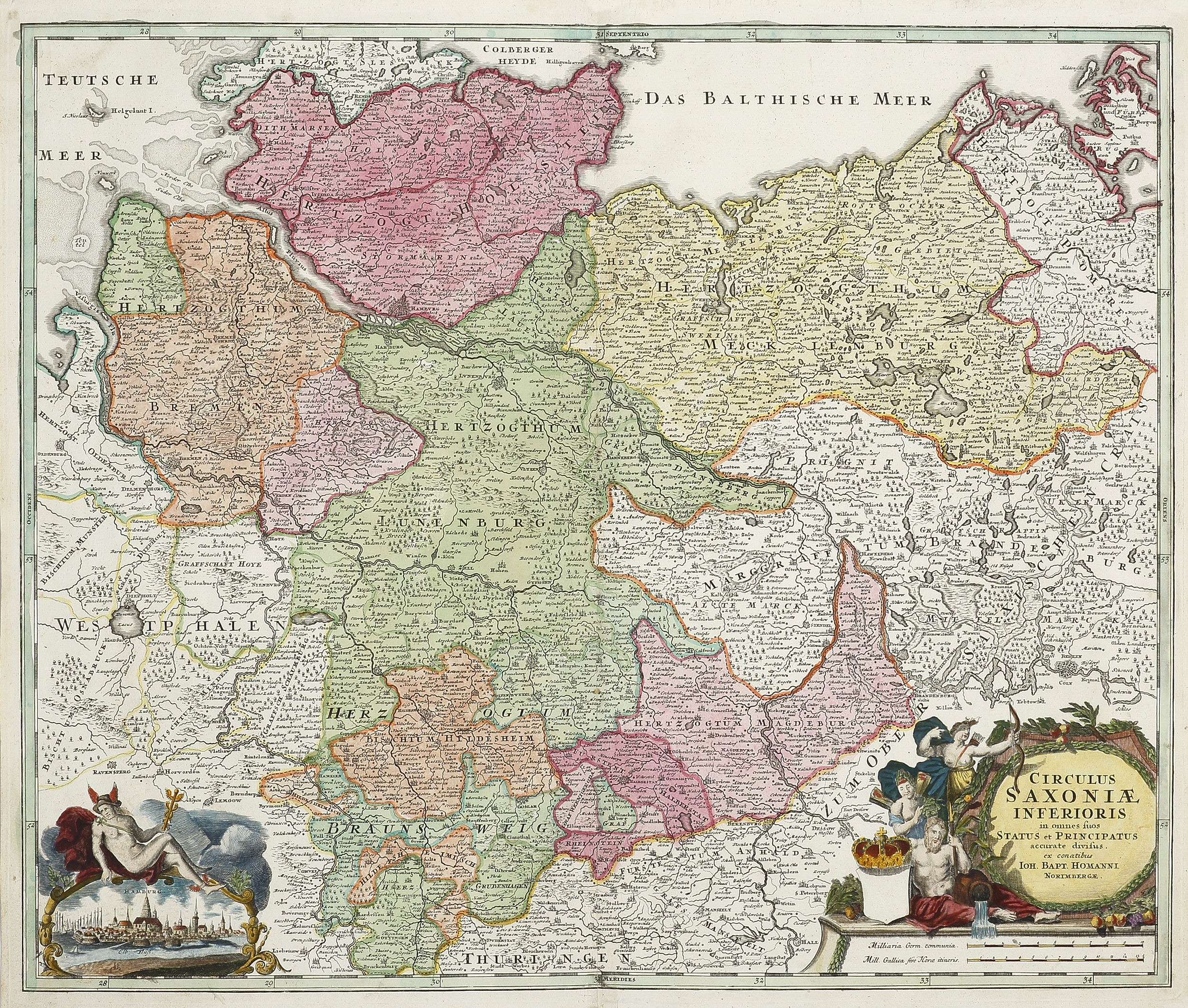 Map of Lower Saxony, extending from the Baltic to Berlin, and Minden. Includes a superb inset of Hamburg with large allegorical figure of Merccury.