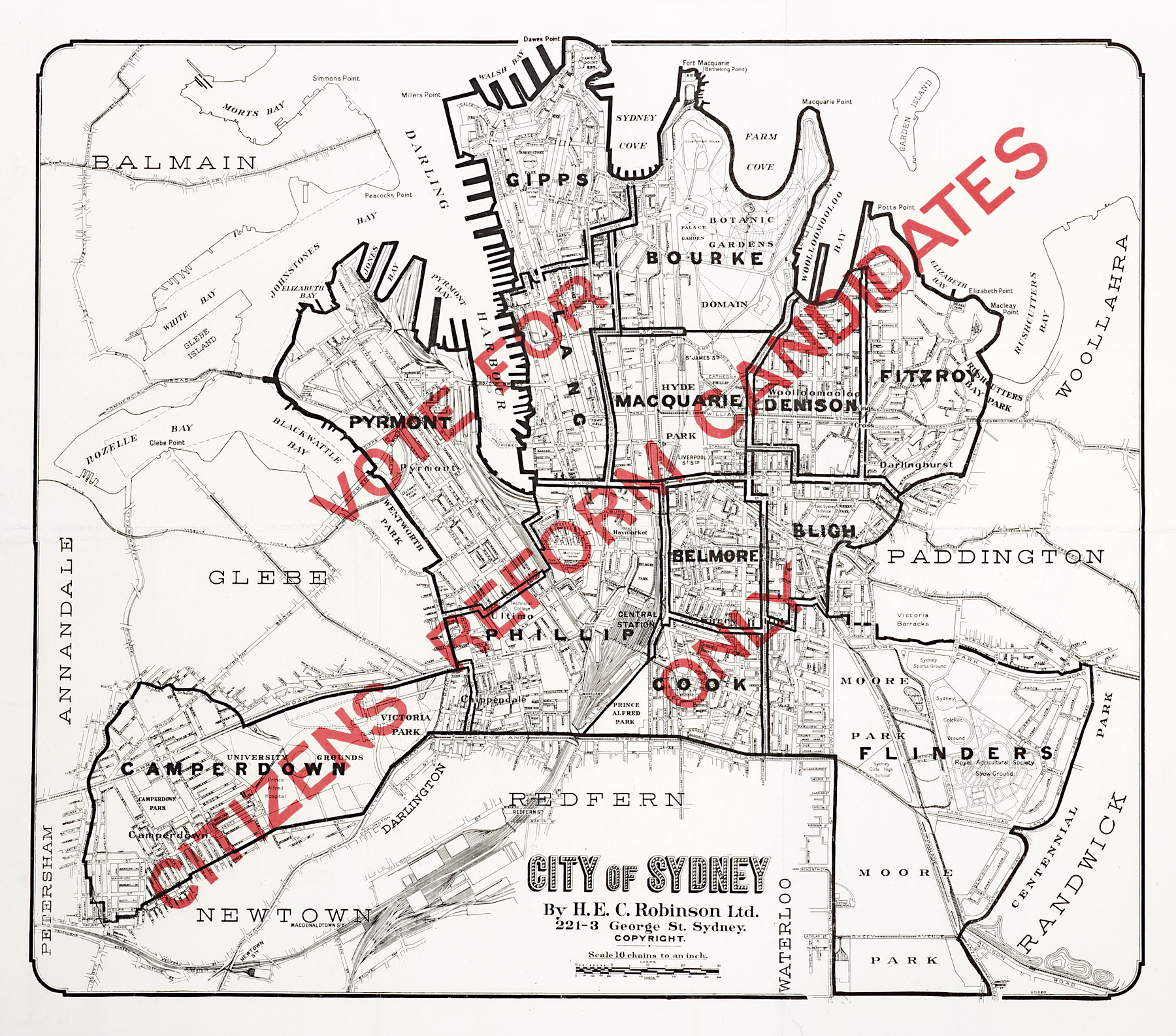 Scarce c.20th map of the city of Sydney overprinted in red with the words; Vote for Citizens Reform Candidates Only.