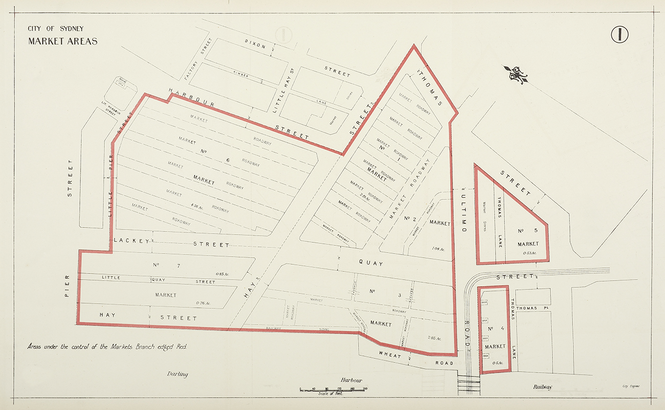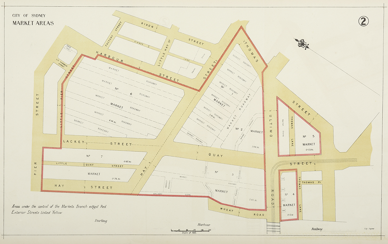 2. Areas under the control of the Markets Branch edged Red. Exterior Streets tinted Yellow.