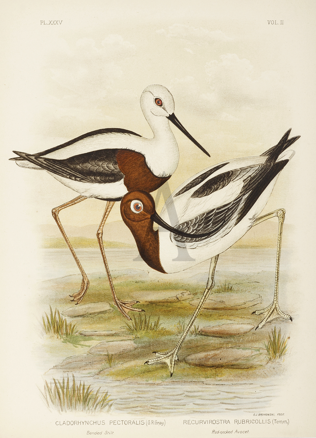 Lithograph of the Banded stilt / Cladorhynchus leucocephalus and the Red-necked avocet / Recurvirostra novaehollandiae. From Broinowski’s Birds of Australia.