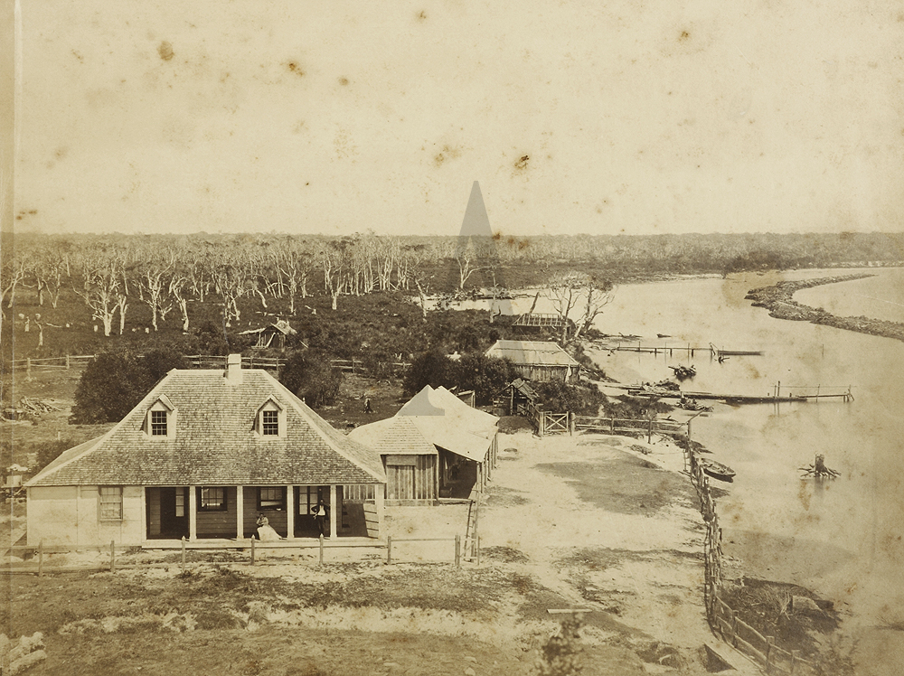 Albumen photograph from the collection of T.N.Page and probably by Lindt. The hotel was built by Walter Black and run from 1862 to 1910. Walter Black died Saturday 11 June 1904 Notice, "of the Woolli Hotel, Yamba, which took place on Thursday, at the age of 72. He was a resident of Yamba for over 30 years, and was much esteemed. He was a native of Cheviot Hills, Scot-land A renewal of the license was granted to Mrs. Black, of Wooli Hotel, Yamba, the rental being fixed at �78 a year and the license at �20. Tuesday 15 January 1907. At was situated at what is now 7 Harbour Street, Yamba.