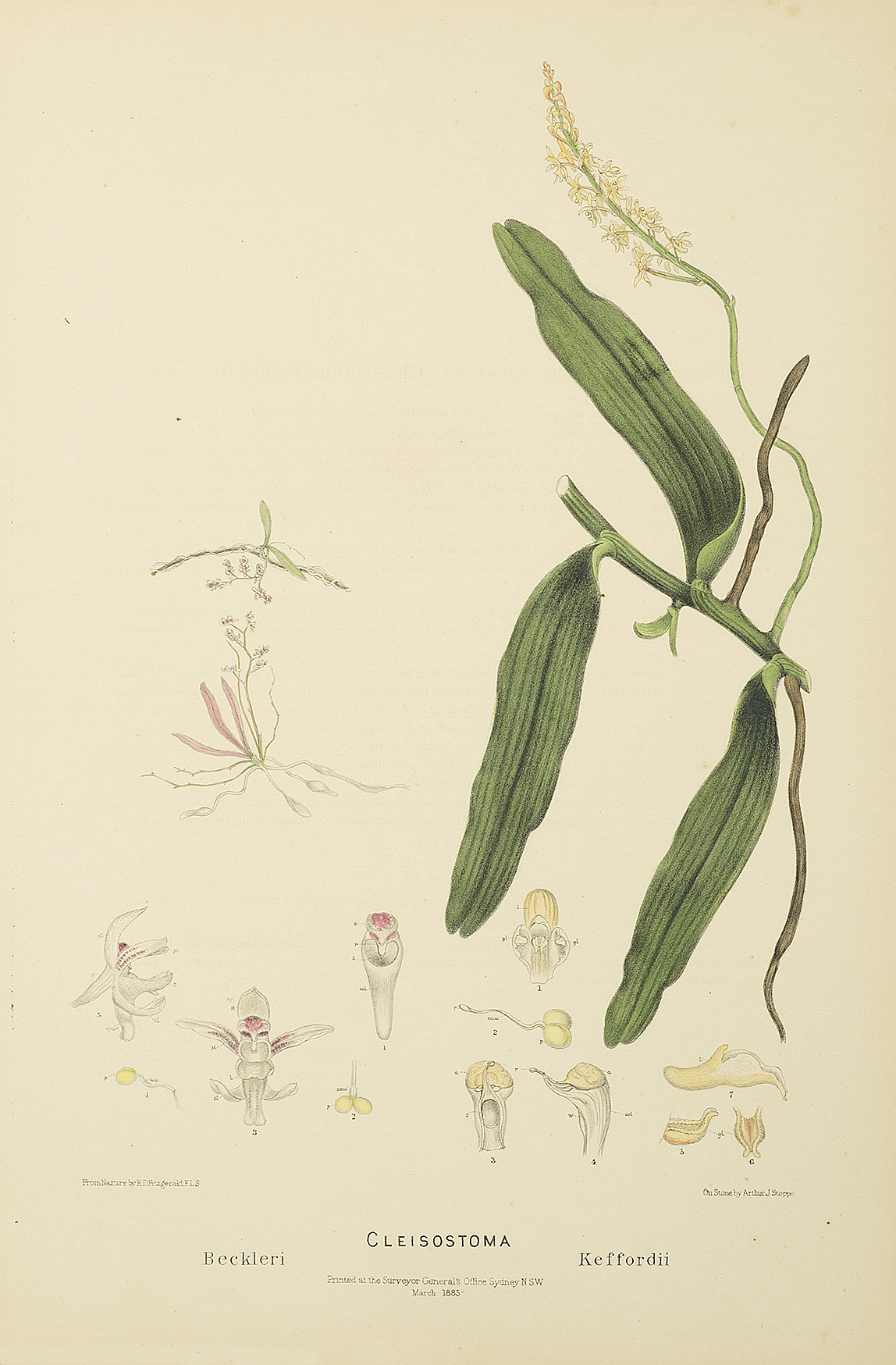 Robert Fitzgerald (1830-1902) Fitzgerald was a surveyor and naturalist, and arrived in Sydney from Ireland in 1856 and soon after was appointed to the Department of Lands as a draftsman for the crown. In his own time Fitzgerald pursued his interest in botany and in 1864 travelled to Wallis Lake, north of Newcastle in New South Wales to collect ferns and orchids which he intended to cultivate around his Hunter's Hill home. This interest in orchids was maintained throughout his life and in 1869, 1871 and 1876 he visited Lord Howe Island to collect further botanical samples. It was during this time that he discovered Dracophyllum fitzgeraldii F. Muell, which was later to be named in his honour. He worked for the Department of Lands and was an enthusiastic field collector, devoting himself especially to the native orchids. The publication of the 'Australian Orchids' was acclaimed throughout the botanical world. J.D. Hooker considered it 'a work which would bring honour to any country and to any botanist', while George Bentham wrote 'thanks to you the Australian Orchidaceae are now better known than those of any country out of Europe'.