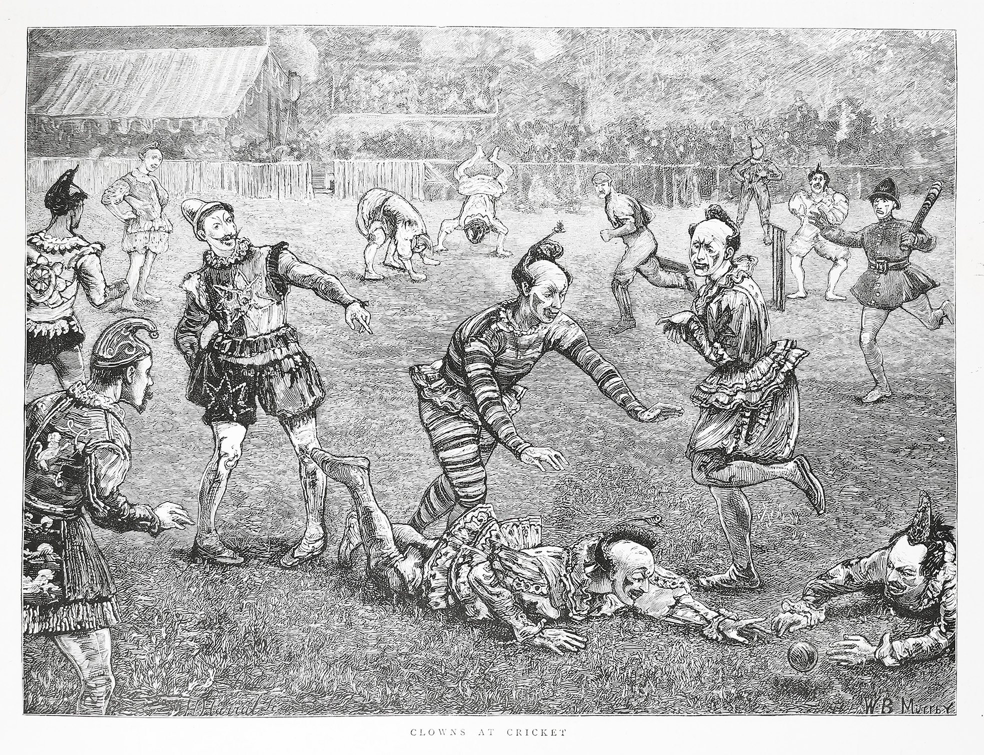 Engraving of clowns playing cricket. From the original edition of The Grphic.
