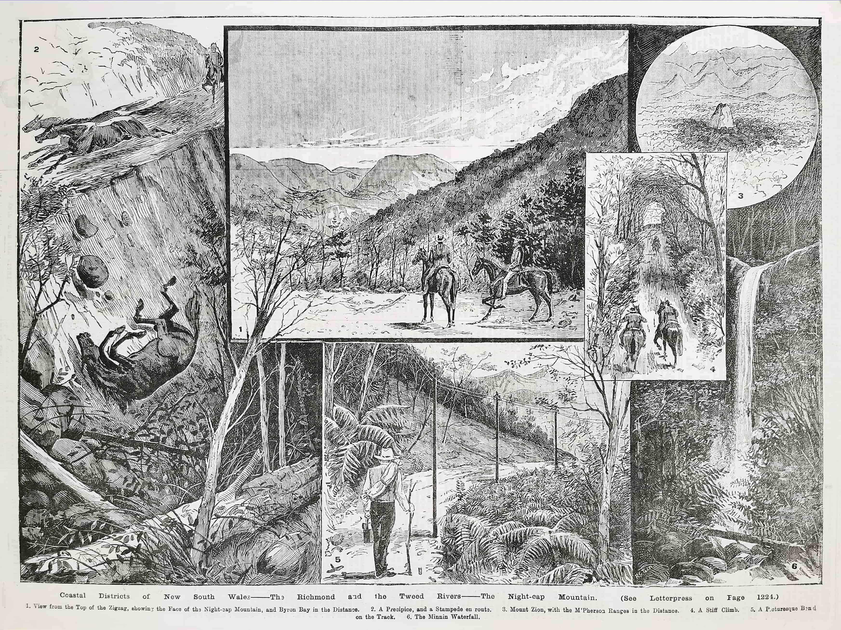 Very rare engraving with multiple inset views of the Richmond and Tweed Rivers of New South Wales. Inset titles; View from the top of the Zigzag, showing the Face of the Night-Cap Mountain, and Byron Bay in the Distance. A … Read Full Description