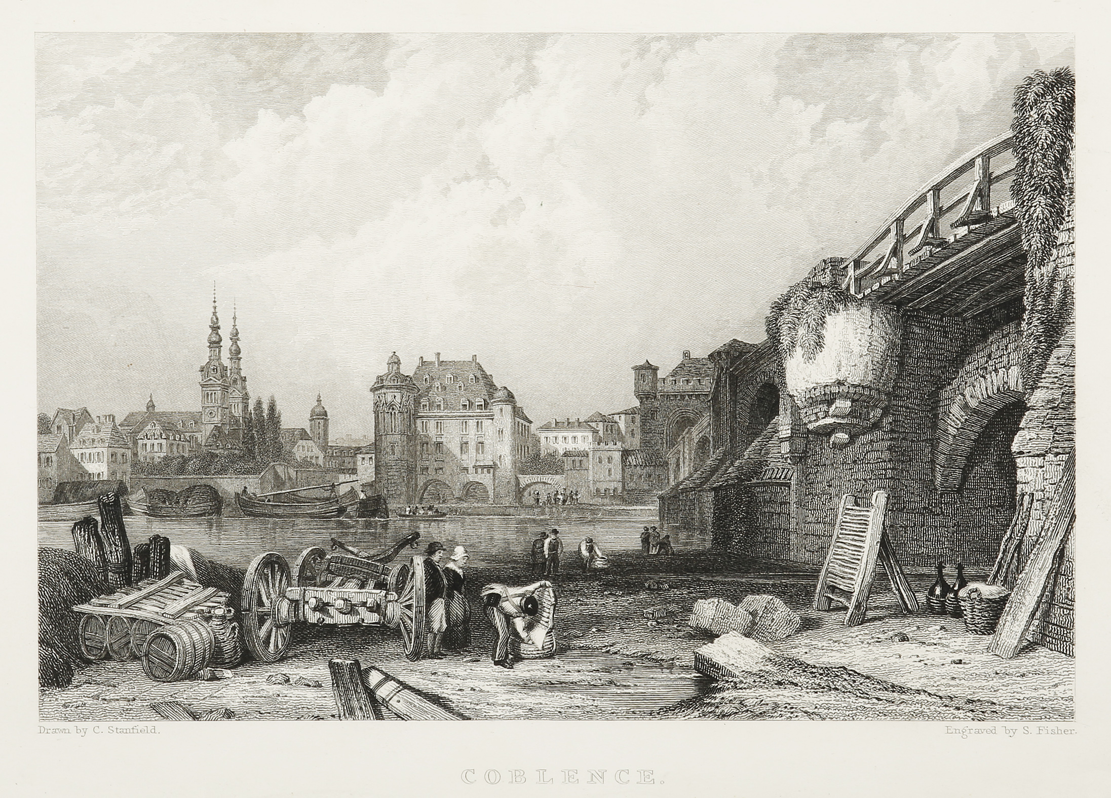 A nineteenth century engraving depicting the city of Koblenz, situated in central Germany, and a gateway to the terraced vineyards and ruined castles of the Rhine Gorge.
