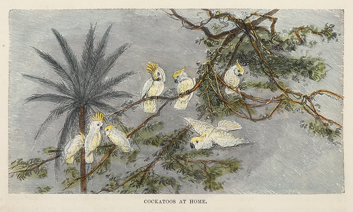 Small c.19th hand coloured engraving of a flock of Sulphur Crested cockatoos.