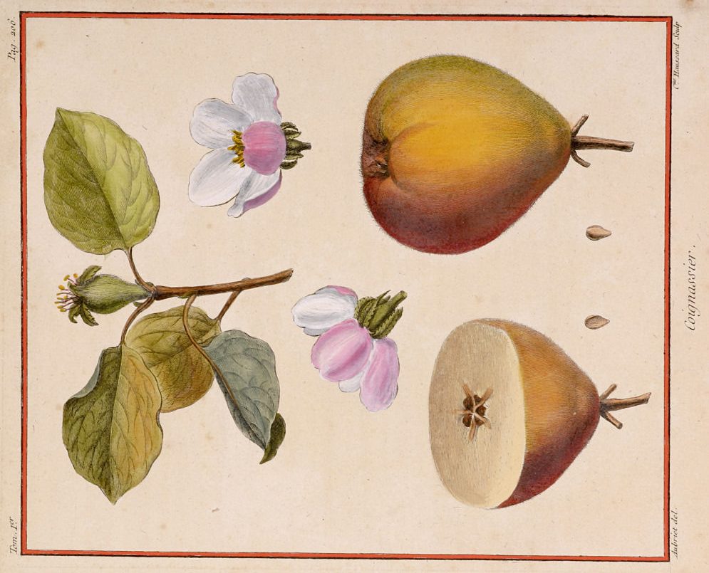 From Duhamel Du Monceau, Traite des Arbres Fruitier,the most influential C18th study on fruit trees. In image plate a cross section of the fruit with the leaves and flowers are depicted.