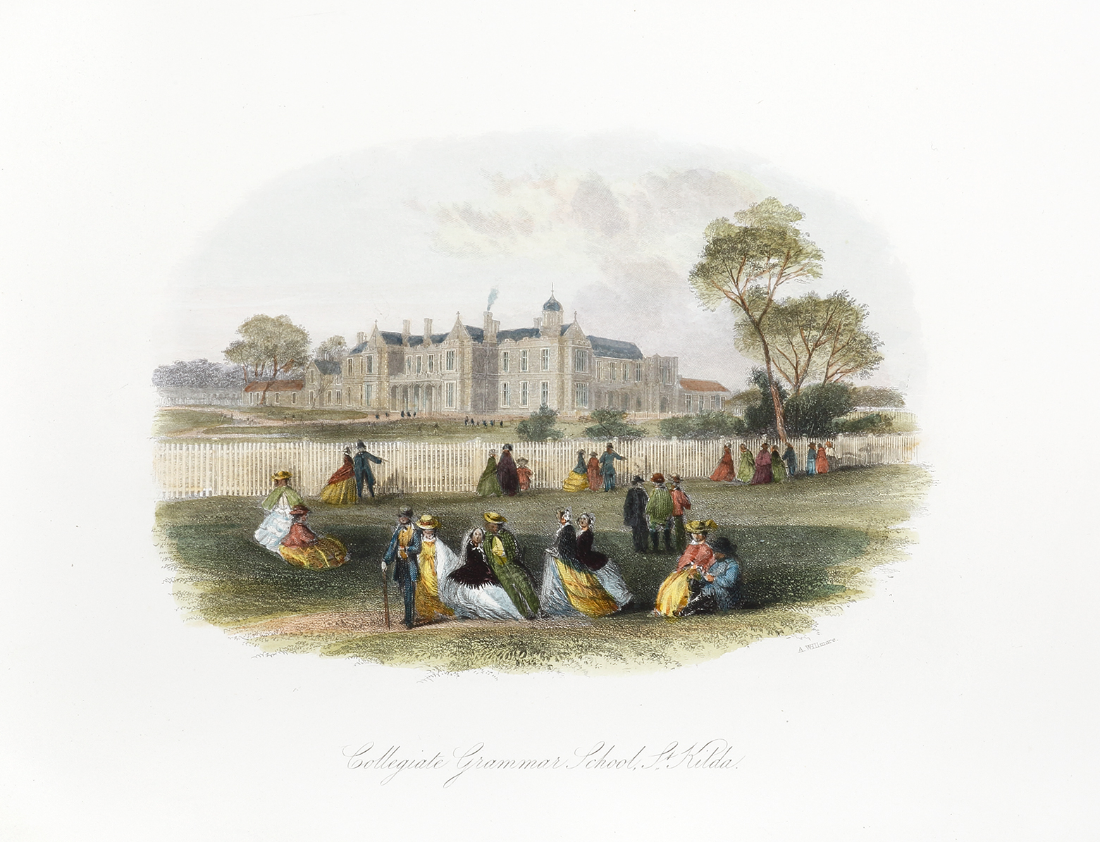 Finely engraved view of Collegiate Grammar School, St Kilda.