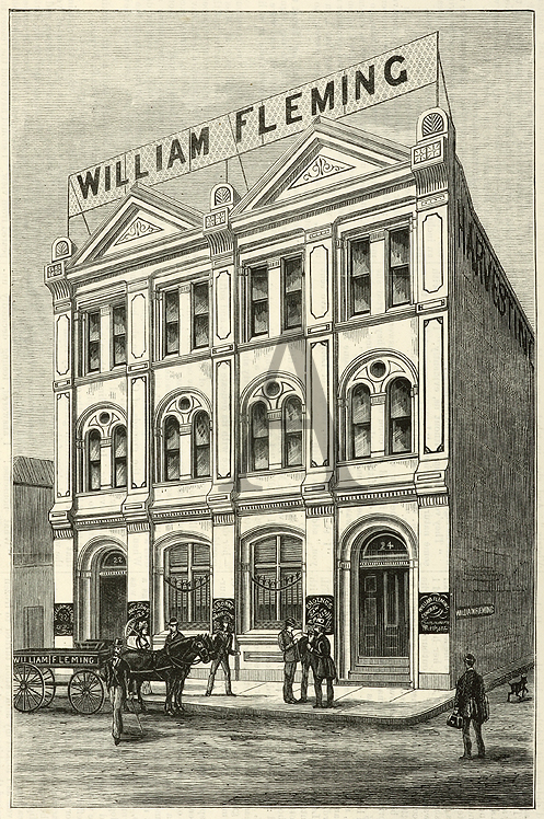 Engraving of William Fleming’s premises at 22 & 24 Clarence Street, Sydney (to the left of present day entrance to Wynyard Station). Rare engraving from the original edition of the Illustrated Sydney News.