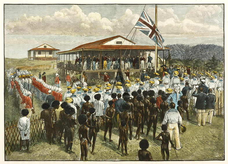 Colonial engraving of Port Moresby in 1884, when Commodore Erskine hoisted the Union Jack and established the Protectorate of British New Guinea.