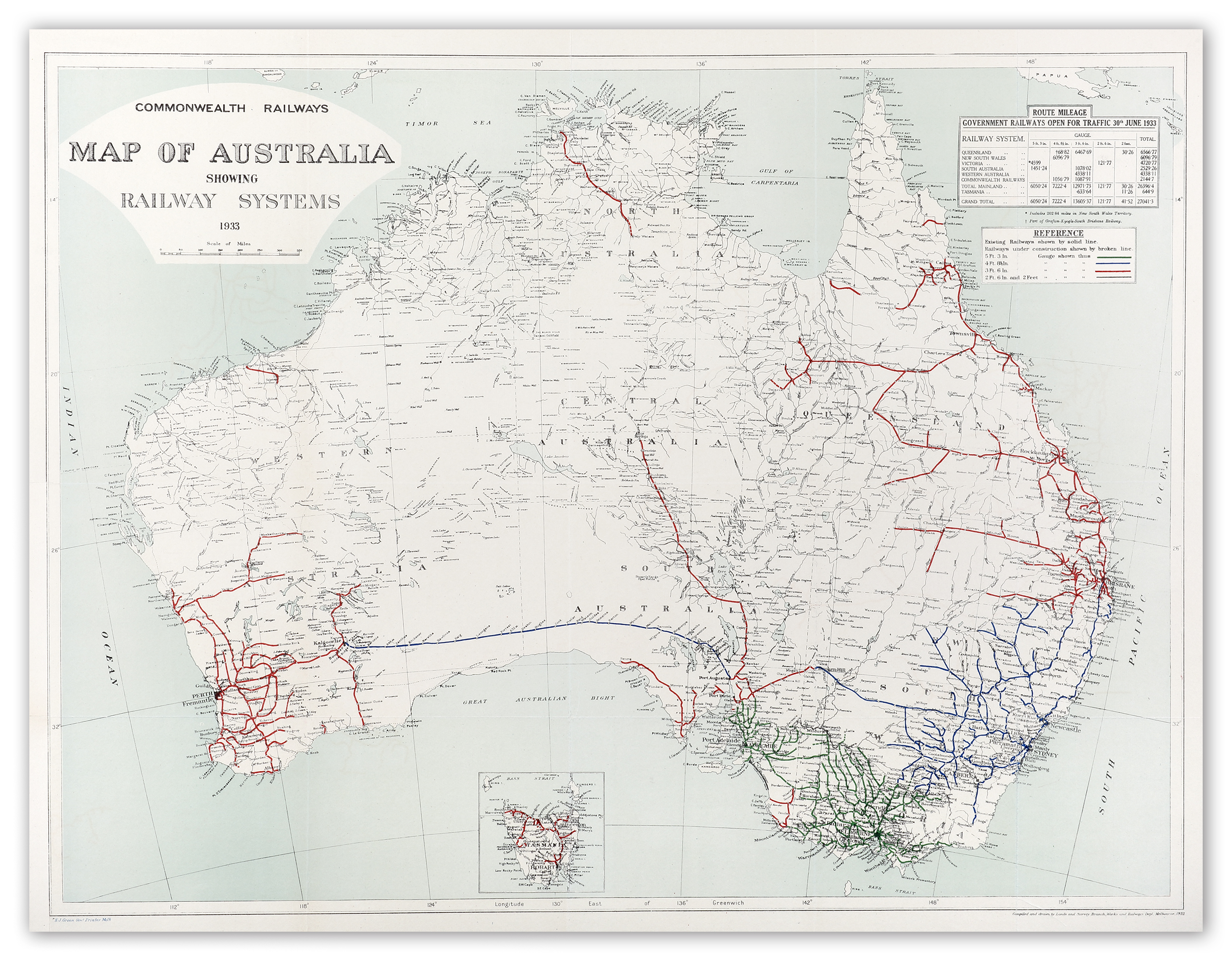 Scarce detailed and up to date large scale map of Australia with an inset of Tasmania showing railways up to 1933. Collections: National Library Australia:   Bib ID4937291 State Library NSW: Call Numbers Z/M3 804gme/1933/1