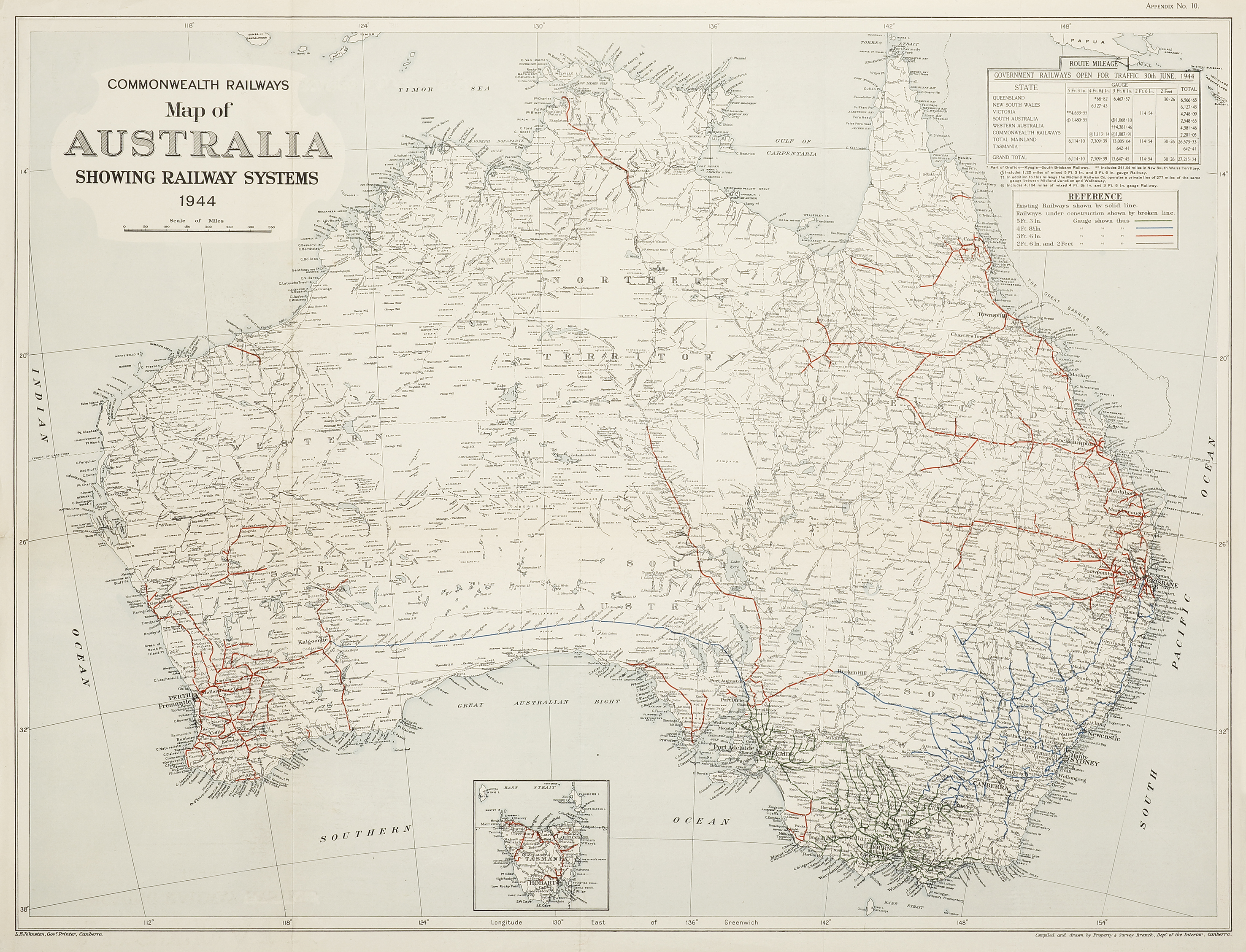 Scarce map of Australia showing Australian railway system in 1944 by Harold Winthrop Clap made for the proposed standardisation of the Australian railway network.