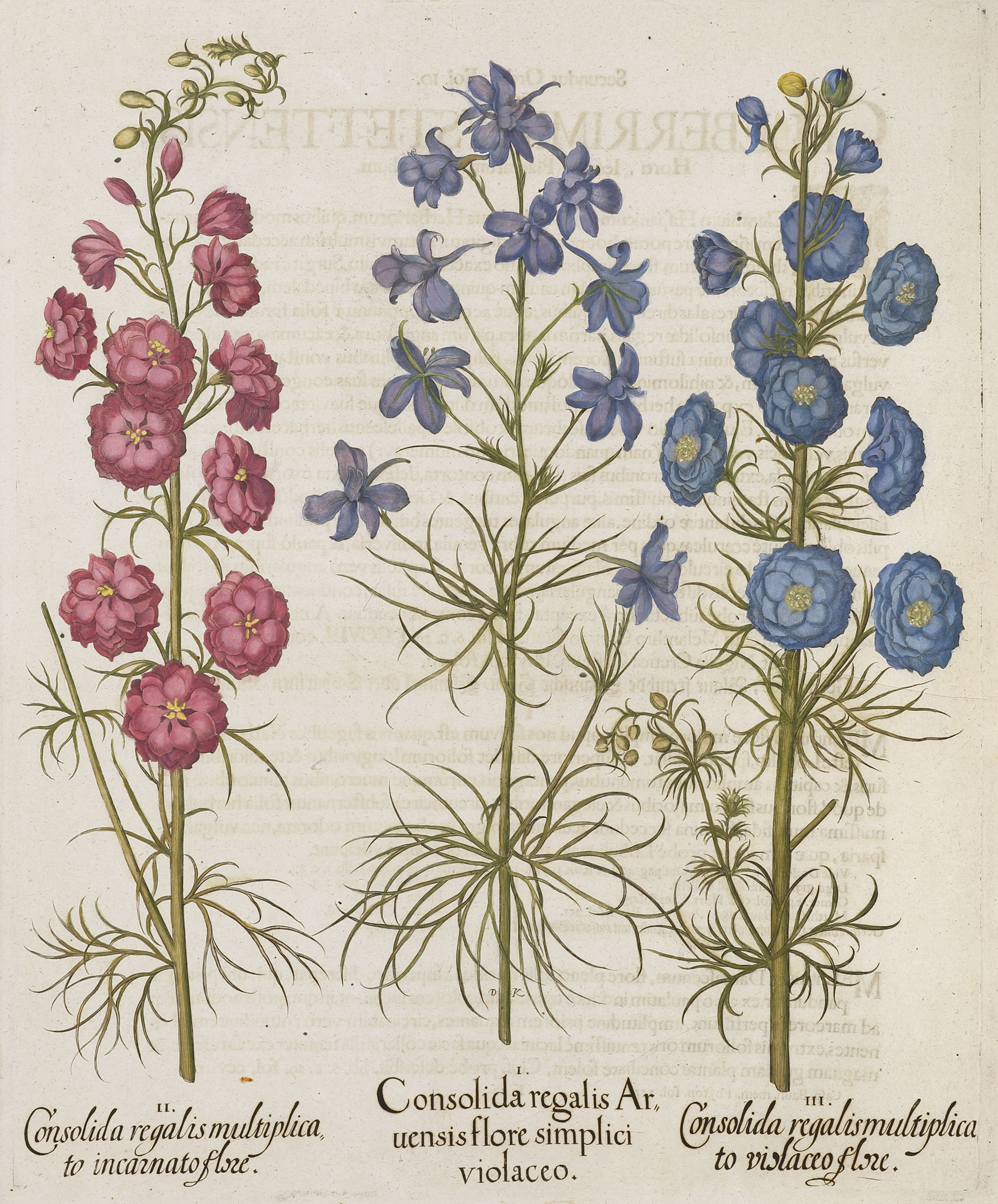 Spectacular c.18th engraving of Forking Larkspur from Basil Besler’s Hortus Eystettensis, the greatest florilegium ever made which recorded all the plants in their actual size in the garden of the Prince Bishop of Eichstatt in Bavaria.