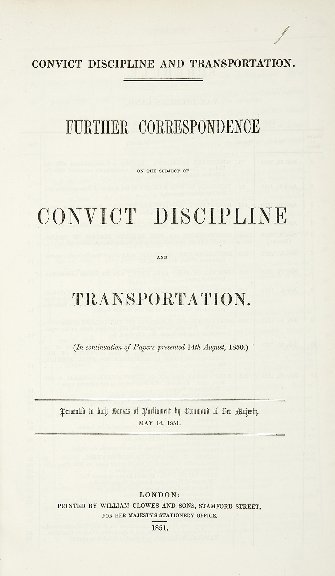 1851. viii + 254pp. Folio. Rebound in blue card covers. British Parliamentary Paper. . Includes reports on arrival of first convicts in Western Australia. (146pp), on Tasmania (64pp), on NSW (Includes accounts of arrival of last direct shipment), of convicts to Moreton Bay (Brisbane)).