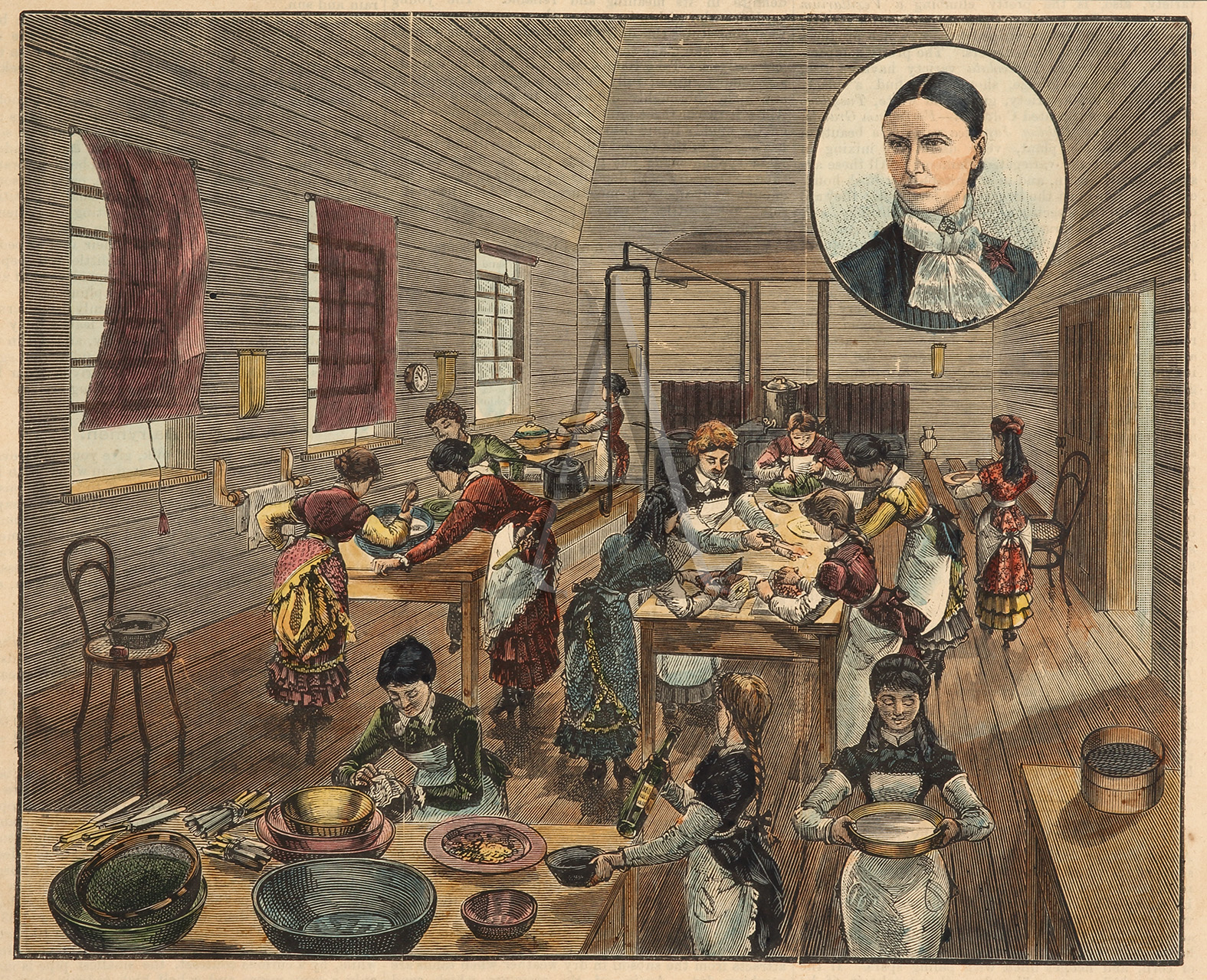 Rare engraving of the ladies cookery class held at High School in Elizabeth Street by Miss Whiteside.