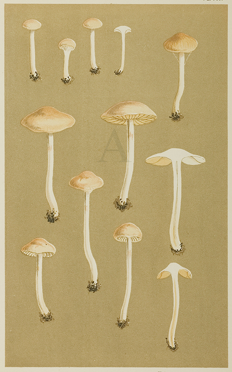 Found in pine woods, near Gainsborough. Lithograph of mushrooms from Illustrations of British Fungi by Mordecai Cubitt Cooke (1825 – 1914) who was an eminent mycologist, and the founder of the journal ‘Grevillea and one of the great promoters of mycology in England. … Read Full Description