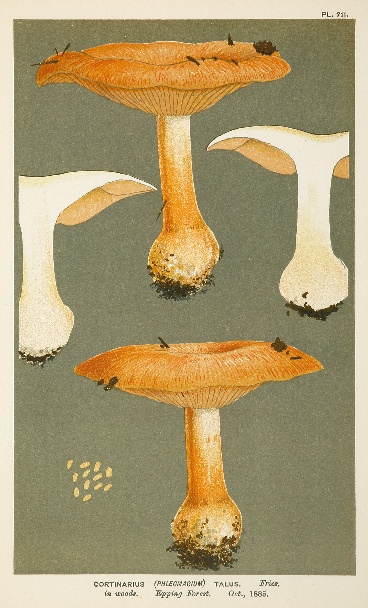 Lithograph of mushrooms from Illustrations of British Fungi by Mordecai Cubitt Cooke (1825 – 1914) who was an eminent mycologist, and the founder of the journal ‘Grevillea and one of the great promoters of mycology in England. ‘Cookes’s most ambitious work, the “Illustrations of British Fungi, is a monumental work of labor and patient application. I am told that not only did he make the original drawings of the plants, but that the figures were actually transferred by Cooke to the stones from which they were printed’ (C.G. Lloyd, Letter no. 57). ‘The number published of the Illustrations of British Fungi must have been very small as there were only 70 subscribers in Britain when volume 2 was issued.’ Stafleu & Cowan