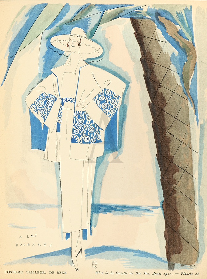 From “Gazette du Bon Ton”, published by Lucien Vogel and his artists all of whom were trained at the Ecole des Beaux Arts. Using the pochoir technique originally employed for colouring woodblock prints in the C15th. Pochoir, used layers of colour to build up the design. As many as thirty stages using gouache paints could be employed in one design. Styles were influenced by art movements such as Cubism, Fauvism and the Russian Ballet. Rare.
