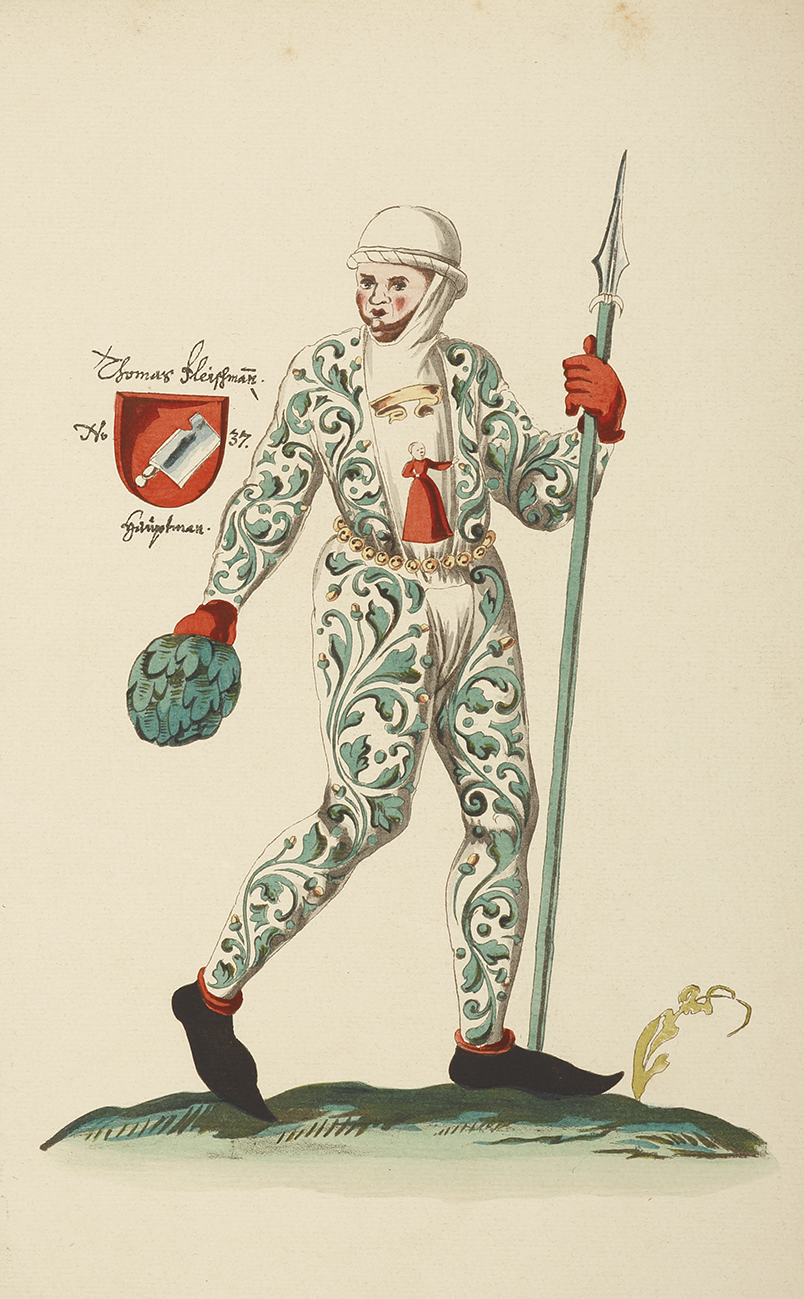 The Schembart Carnival was a pre-Lenten festival held in Nuremberg from the late 14th century until it was ended in 1539. “Shembart” means “beardmask,” and refers to the wooden beards often worn as part of the elaborate costumes in the parade. The tradition began has a reward for butchers who backed the City Council during a 1348 revolt of trade guilds. The butchers were granted the right to perform a Shrovetide dance through the city center, with the path for the dancers cleared by a procession of masked men. Over time, the elite began to pay for the right to participate in the procession, and the costuming grew ever-more elaborate, with extravagant horse-drawn floats called “Hells.” It was finally ended where a preacher complained of his depiction in an effigy showing him holding a backgammon board (a common gambling game) and cavorting with demons and fools. The costumes became a popular subject for artists and numerous color illustrations were produced after the tradition ended.