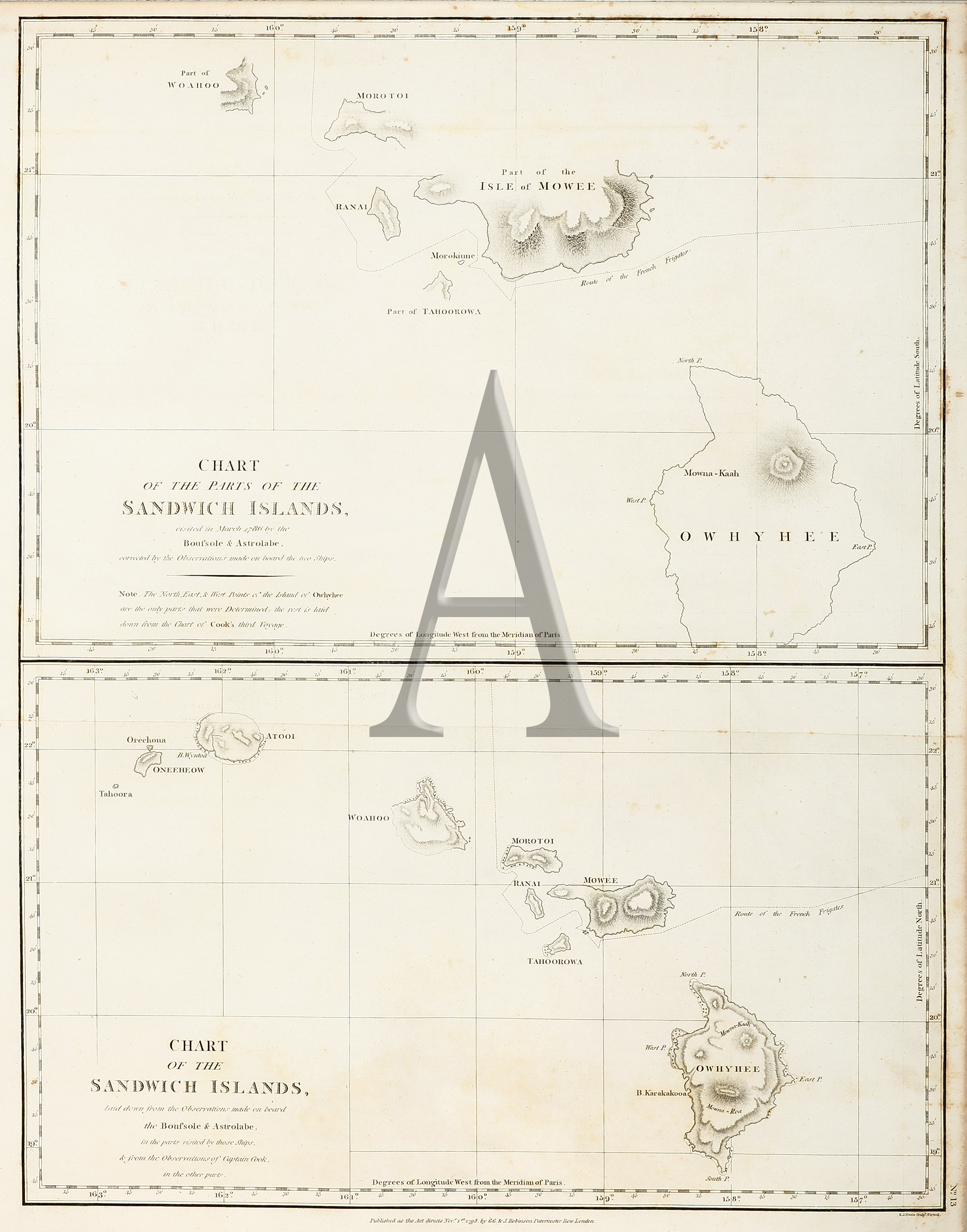 Important chart of the Hawaiian Islands divided into two sections, with the tracks of La Perouse’s ships, the Boussole and Astrolabe. The chart records James Cook’s discovery of the Hawaiian Islands in 1778.