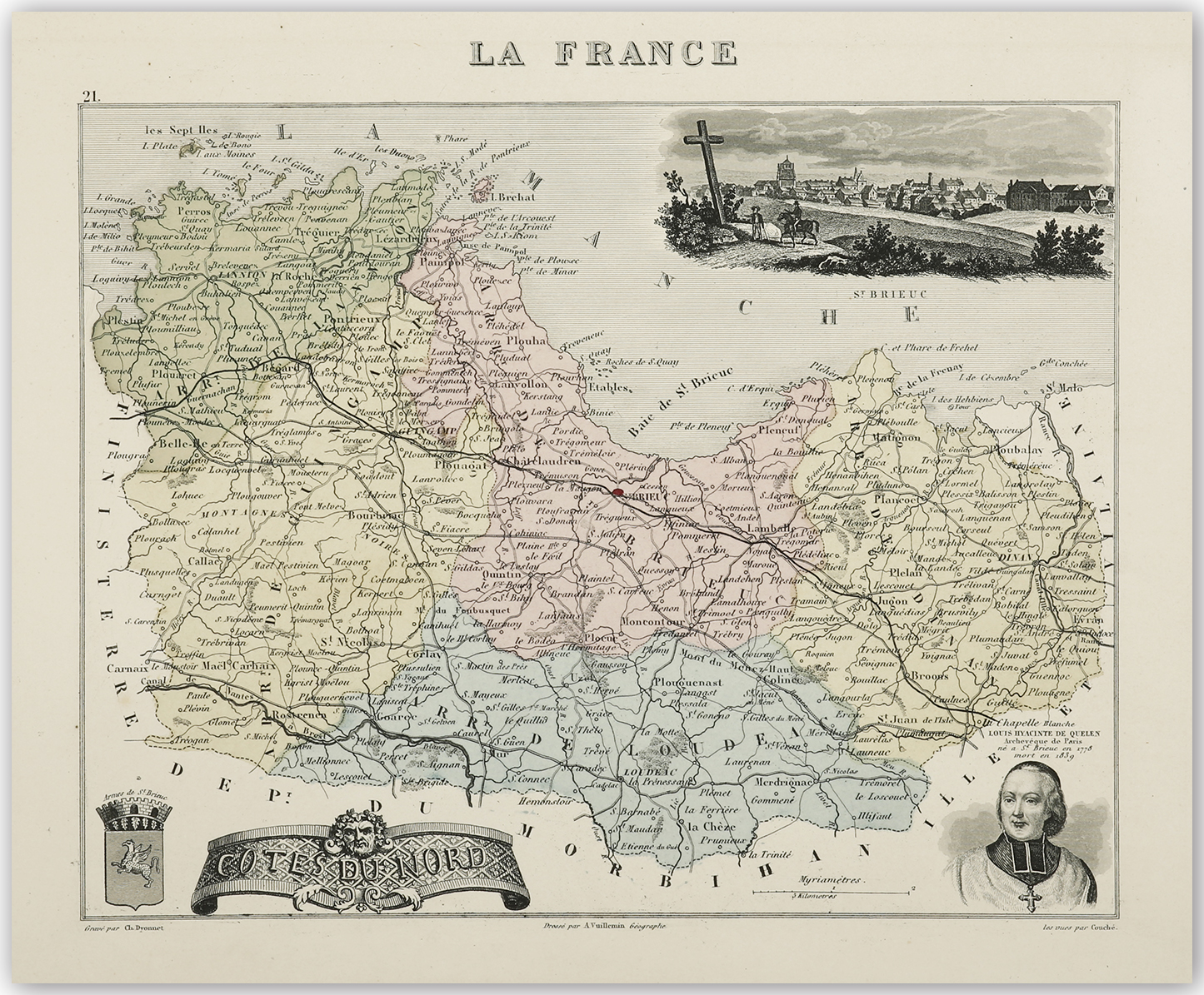 Decorative C19th map with numerous vignettes including a view of St. Brieuc.