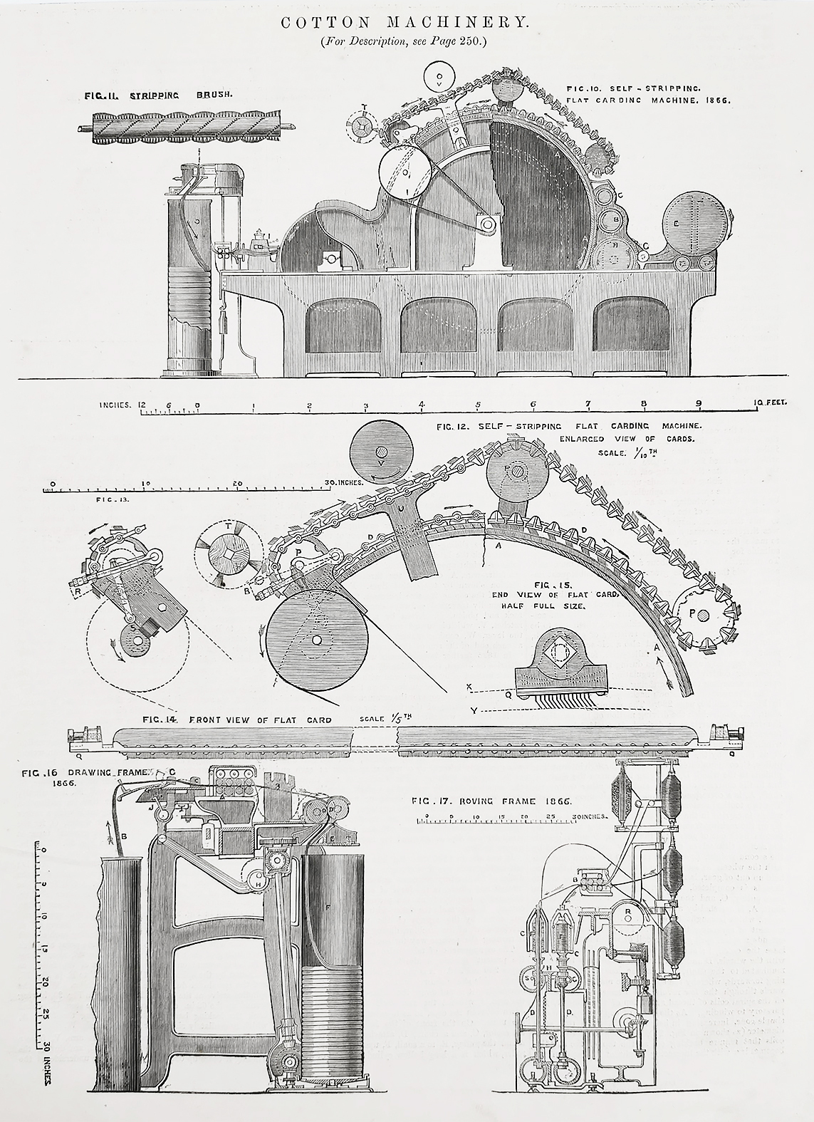 Detailed c.19th engraving of cotton machinery.