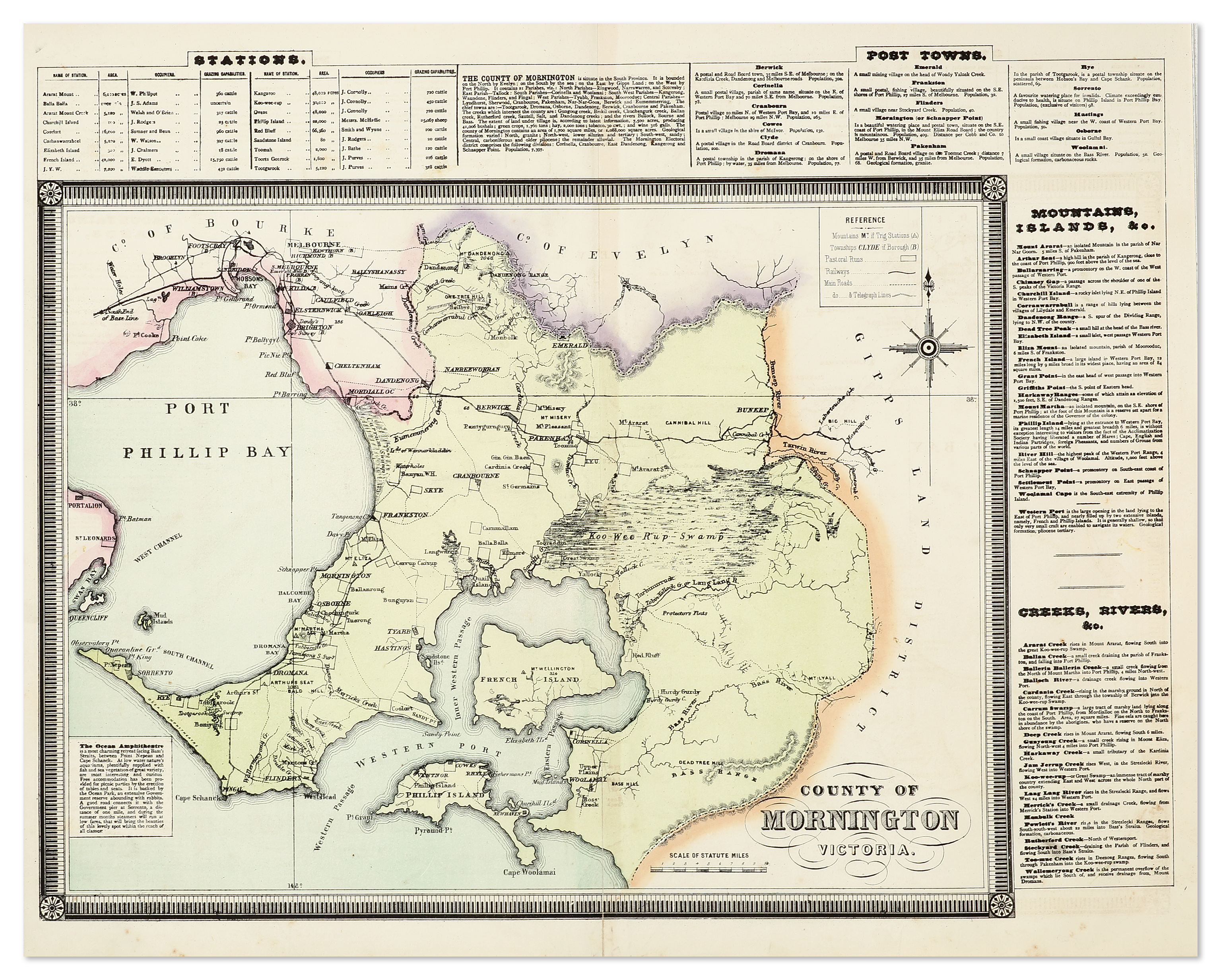 Scarce map of the County of Mornington Victoria from the first county atlas published of the state, extending west to Queenscliff, to Buneep in the east and north to Melbourne and south to Phillip Island. Roads and pastoral runs are shown. Surrounding the map are detailed lists of Creeks, Stations, Post Towns and Mountains. The best C19th map produced of the Mornington Peninsula.