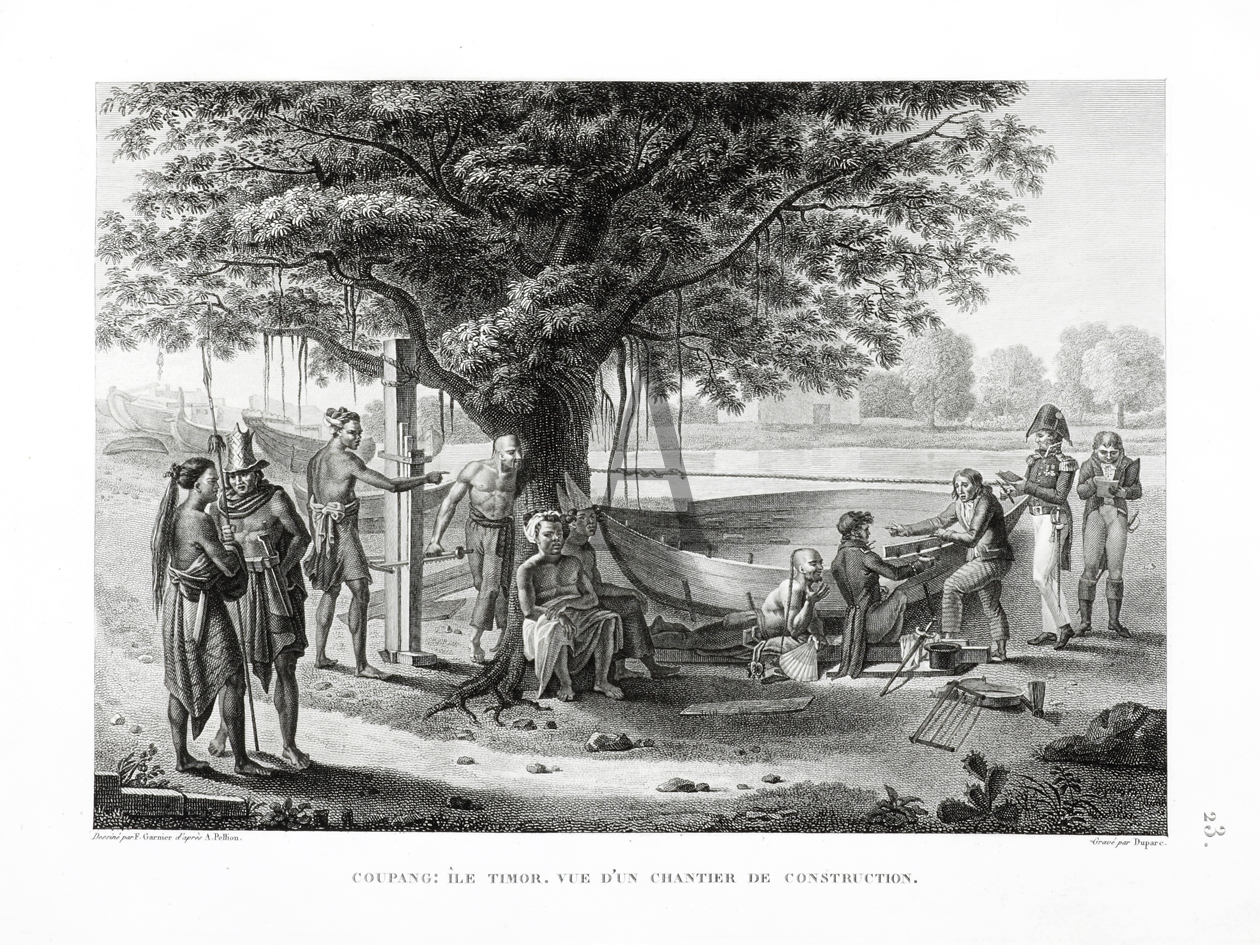 After the dramatic defeat of the first French Empire and the signing of the Treaty of Paris in 1815, the newly restored Bourbon King Louis XVIII ordered a number of voyages of exploration and discovery in an attempt to regain French prestige. One of these was to be led by Louis de Freycinet who had been the commander of the Casuarina on the ill-fated Baudin expedition. The ship chosen for this expedition was named Uranie in honour of the muse of astronomy and geography. Freycinet proposed to undertake numerous measurements in various fields of science and to explore the islands in the Pacific. The voyage was a great success having resulted in the discovery of hundreds of new species of mammals, birds, marine life, plants as well as having recorded many aspects of the Pacific islands. These exquisitely engraved prints constitute a unique documentation of exotic unknown lands and their inhabitants.