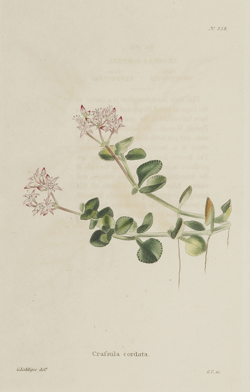 Fine early c.19th botanical engraving of the Heart-leaved Crassula, by Conrad Loddiges, The Botanical Cabinet, which was published from 1817 to 1822.